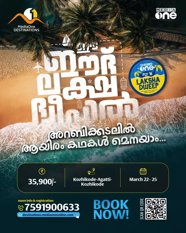 ഇത്തവണത്തെ ഈദ് എവിടെയാക്കാനാണ് ആലോചന? ആഘോഷം കഴിഞ്ഞ കുടുംബത്തോടൊപ്പം ചെറിയ യാത്രകൾ പതിവല്ലേ? ഇത്തവണ ആ യാത്ര ഒന്നു വിപുലമാക്കാം, കുടുംബത്തിന് ഒരു അവധിക്കാല സമ്മാനവും നൽകാം. കേരളത്തിന് തൊട്ടപ്പറുത്തുള്ള കൊച്ച് ദ്വീപുകളിലേക്ക് പോകാം. രാജ്യത്തെ തന്നെ ഏറ്റവും വലിയ ബീച്ച് ഡെസ്റ്റിനേഷനുകളിലൊന്നിലാക്കാം ഇത്തവണത്തെ ഈദ്. അറബിക്കടലിൽ ചിതറി കിടക്കുന്ന മുത്ത് പോലെയുള്ള ലക്ഷദ്വീപികളിലേക്ക് പോകാനുള്ള അവസരമൊരുക്കുകയാണ് മീഡിയവൺ ഫ്ലൈ ടു ലക്ഷദ്വീപ് ട്രീപ്പ്.