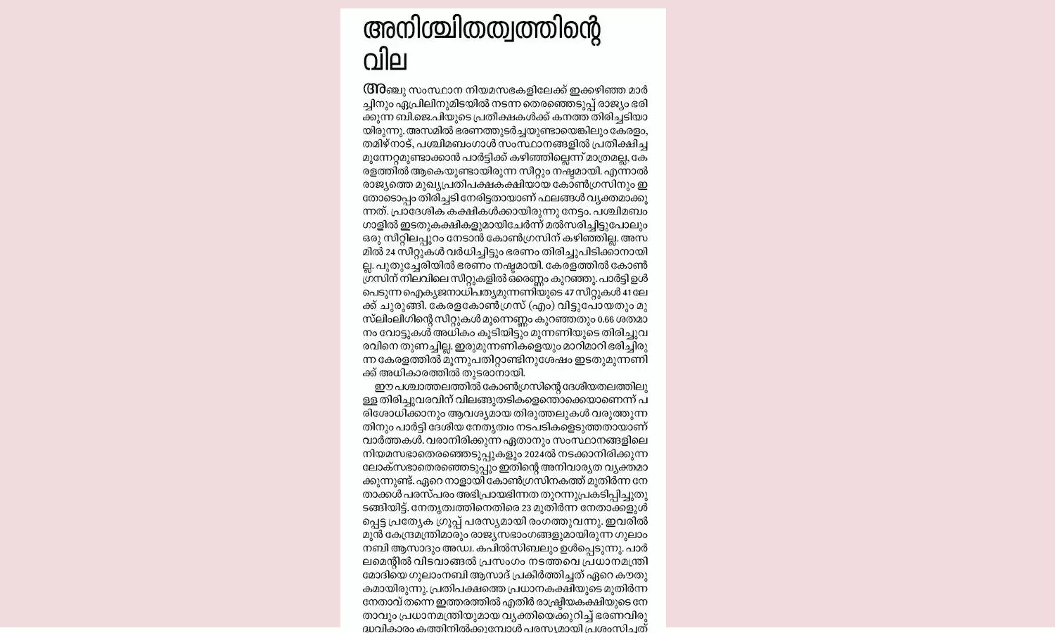 ഇന്ത്യയുടെ നാലു പതിറ്റാണ്ടത്തെ ഭരണം കയ്യിലേന്തിയ കക്ഷിയെന്നതിലുപരി രാജ്യത്തെ എല്ലാപ്രദേശത്തും സര്വവിഭാഗം ജനങ്ങളിലും സ്വാധീനമുള്ള പ്രസ്ഥാനമാണ് സ്വാതന്ത്ര്യസമരത്തിന് നേതൃത്വംനല്കിയ ഇന്ത്യന് നാഷണല്കോണ്ഗ്രസ്. വിവിധ ജാതിമത വിഭാഗങ്ങളെ ഒരു മാലയിലെ മുത്തുമണികളെപോലെ കാത്തു സംരക്ഷിക്കുന്ന സംഘടനയും കോണ്ഗ്രസ്പോലെ ഇന്നും വേറെയില്ല. അതുകൊണ്ട് കോണ്ഗ്രസിന്റെ നിലനില്പും ഉയര്ച്ചയുമാണ് മഹാഭൂരിപക്ഷം ജനങ്ങളും കാംക്ഷിക്കുന്നത്. രാജ്യത്തെ വര്ഗീയതയിലേക്കും ഭിന്നിപ്പിലേക്കും വലിച്ചിഴച്ചുകൊണ്ടുപോയി ഭരണഘടനതകര്ത്ത് ഏകമതാത്മക രാഷ്ട്രം സൃഷ്ടിക്കാനുള്ള പണിപ്പുരയിലിരിക്കുന്ന ആര്.എസ്.എസ്സിന്റെയും ബി.ജെ.പിയുടെയും കരങ്ങളില്നിന്ന് രാജ്യത്തെയും ജനങ്ങളെയും രക്ഷിച്ചെടുക്കേണ്ട നിര്ണായക ഘട്ടമാണിതെന്ന് മനസ്സിലാക്കിയവര് അതിനനുസരിച്ചുള്ള നടപടികള് സ്വീകരിക്കണം. പഞ്ചാബിലും ഛത്തീസ്ഗഡിലും മാത്രമായി കോണ്ഗ്രസിന് ഭരണം നിലനിര്ത്താനായത് മതതേര വിശ്വാസികളെ സംബന്ധിച്ചിടത്തോളം ചെറിയ അലോസരമല്ല ഉണ്ടാക്കിയിട്ടുള്ളത്. കേരളത്തിന്റെ പ്രതീക്ഷകളും ഇത്തരത്തിലായേക്കുമോയെന്ന ആധിയിലാണിന്ന് മതേതര ജനത.