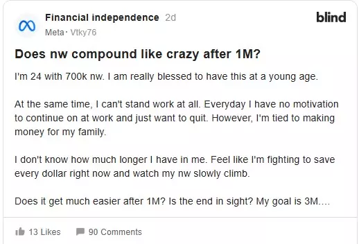 വിരമിക്കുന്നതിന് മുൻപ് തന്റെ ആസ്തി മൂന്ന് മില്യൺ ഡോളറാക്കുകയാണ് ലക്ഷ്യമെന്നും ഓരോ ഡോളറും ലാഭിക്കാൻ പാടുപെടുകയാണെന്നും യുവാവ് പറയുന്നു. ഒരു വ്യക്തിയുടെ ആസ്തി 1 മില്യൺ ഡോളറിലെത്തിയാൽ അത് ഭ്രാന്തുപോലെയാകും എന്നത് ശരിയാണോ എന്ന് മെറ്റാ ജീവനക്കാരൻ ചോദിക്കുന്നു. ''എനിക്കീ ജോലി ഒട്ടും ഇഷ്ടമില്ല. എല്ലാ ദിവസവും ജോലിക്കാൻ പോകാൻ പറ്റുന്ന വിധത്തിൽ ഒന്നും അവിടെയില്ല. ജോലി ഉപേക്ഷിക്കാൻ ആഗ്രഹിക്കുന്നു. പക്ഷേ എന്റെ കുടുംബത്തിന് പണം ആവശ്യമാണ്. അതുകൊണ്ട് ജോലി ഉപേക്ഷിക്കാനും പറ്റാത്ത സാഹചര്യമാണ്'' അദ്ദേഹം വിശദീകരിക്കുന്നു.