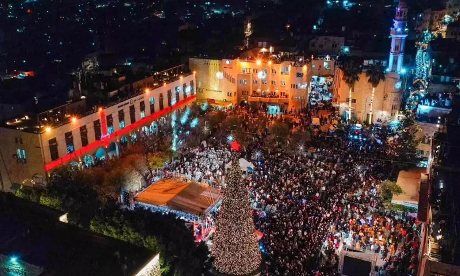 |ശനിയാഴ്ച രാത്രി നഗരമധ്യത്തിലെ തിരുപ്പിറവി ചത്വരത്തില് സ്ഥാപിച്ച ക്രിസ്മസ് ട്രീയില് വിളക്കുതെളിഞ്ഞതിന് ശേഷമുള്ള ചടങ്ങിനായി വെസ്റ്റ് ബാങ്കില് നിന്ന് ആയിരക്കണക്കിന് ഫലസ്തീനികളെത്തിയിരുന്നു
