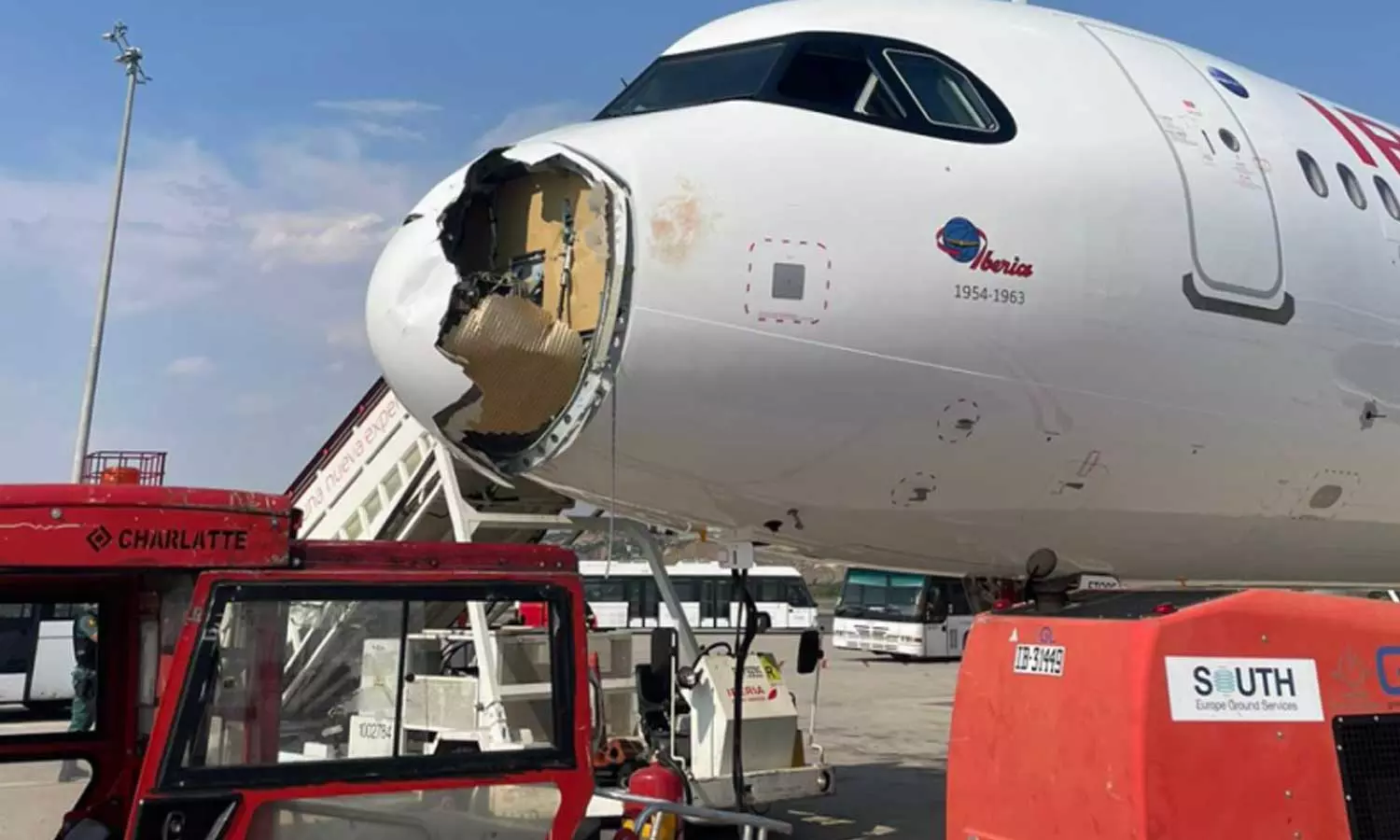 തുടര്ന്നാണ് വിമാനം അടിയന്തരമായി ലാൻഡ് ചെയ്തത്. ഐബീരിയ എയർബസ് A321-253NY (XLR) വിമാനത്തിന്റെ മുൻഭാഗമാണ് തകർന്നത്. ക്യാബിനിൽ പുക നിറഞ്ഞതോടെ യാത്രക്കാർ ഓക്സിജൻ മാസ്കുകൾ ധരിച്ചു. വിമാനത്തില് മാസ്ക് ധരിച്ച് യാത്രക്കാര് ഇരിക്കുന്നതും വിമാനത്തിന്റെ മുന്ഭാഗം തകര്ന്നതും പുറത്തുവരുന്ന ചിത്രങ്ങളിലുണ്ട്.