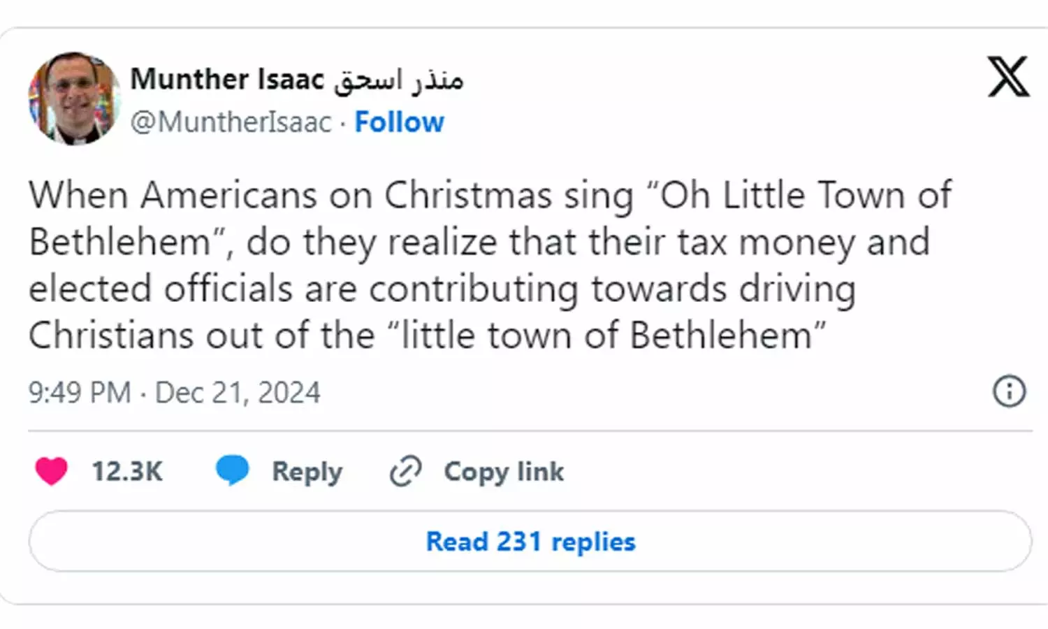 ബെത്ലഹേമിലെ ഇവാഞ്ചലിക്കൽ ലൂഥറൻ ചർച്ച് പാസ്റ്റർ മുൻതർ ഐസക്കിെൻറ പോസ്റ്റ് സാമൂഹിക മാധ്യമങ്ങളിൽ വലിയ ചർച്ചയാകുന്നുണ്ട്. ഇവിടെ എന്താണ് സംഭവിക്കുന്നതെന്ന് അറിയാതെയാണ് ക്രിസ്മസിന് അമേരിക്കക്കാർ ബെത്ലഹേമിനെക്കുറിച്ച് പാടുന്നതെന്ന് അദ്ദേഹം വിമർശിച്ചു. അമേരിക്കയുടെ നികുതിപ്പണവും തെരഞ്ഞെടുക്കപ്പെട്ട ഉദ്യോഗസ്ഥരും ക്രിസ്ത്യാനികളെ ചെറിയ പട്ടണമായ ബെത്ലഹേമിൽനിന്ന് പുറത്താക്കാൻ കൂട്ടുനിൽക്കുകയാണെന്ന് അവർ അറിയുന്നുണ്ടോയെന്നും അദ്ദേഹം അമേരിക്കക്കാരോട് ചോദിച്ചു.
