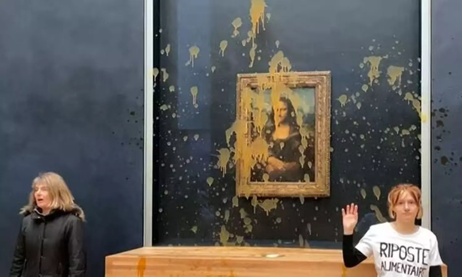 മോണാലിസ പെയിന്റിങ്ങിൽ സൂപ്പൊഴിച്ച് പ്രതിഷേധം; ബുള്ളറ്റ് പ്രൂഫുള്ളതിനാൽ കേടുപാടുണ്ടായില്ല