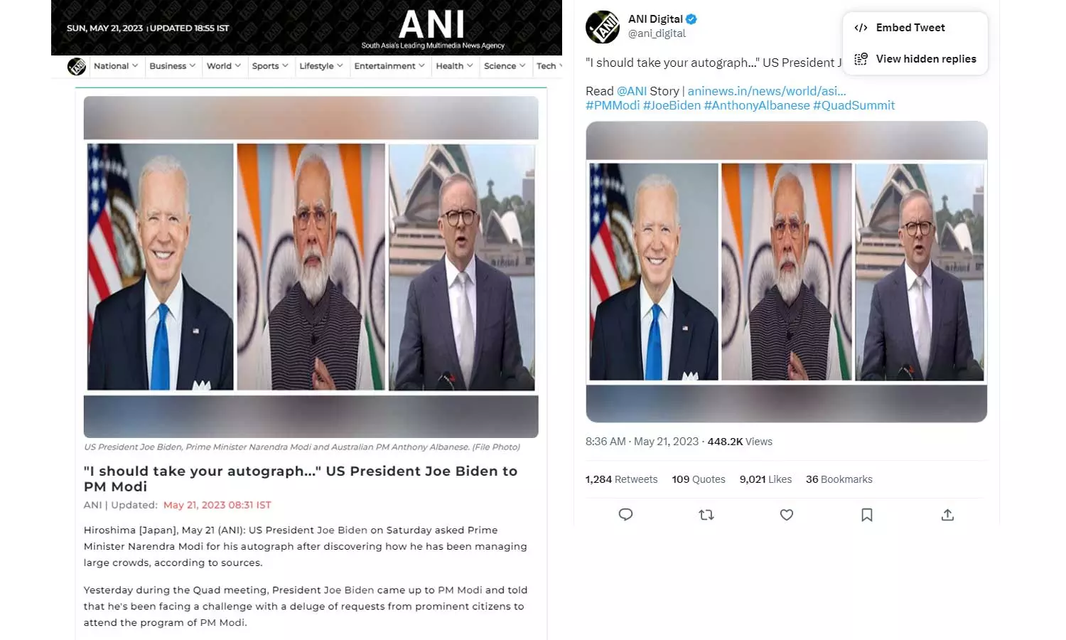 നരേന്ദ്രമോദി സ്റ്റേഡിയത്തിൽ 90,000ത്തിലധികം ആളുകൾ പ്രധാനമന്ത്രി മോദിയെ സ്വീകരിക്കാനുണ്ടായിരുന്നതായി പ്രധാനമന്ത്രി അൽബനീസ് പറഞ്ഞപ്പോഴാണ് ജോ ബൈഡൻ പ്രധാനമന്ത്രി മോദിയോട് എനിക്ക് താങ്കളുടെ ഓട്ടോഗ്രാഫ് വേണം എന്ന് പറഞ്ഞത് എന്നാണ് എഎൻഐ റിപ്പോർട്ടിലെ അവകാശവാദം.