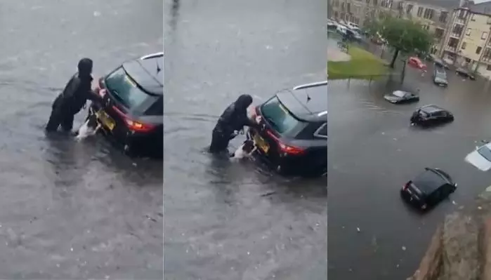 കനത്ത മഴയെ തുടര്ന്നുണ്ടായ വെള്ളപ്പൊക്കത്തില് വലയുകയാണ് സ്കോട്ട്ലാന്ഡ്. റോഡിലും മറ്റും വെള്ളം കയറിയതിനാല് ഗതാഗതവും ബുദ്ധിമുട്ടിലായി. ഇതിനിടയില് വെള്ളക്കെട്ടില് കുടുങ്ങിപ്പോയ ഒരു കാര് തള്ളിനീക്കുകയാണ് ലോറി ഗില്ലീസ് എന്ന യുവതി. ഗില്ലീസും അവരുടെ പക്ക് എന്ന നായയും കൂടി പതിവ് നടത്തത്തിന് ഇറങ്ങിയപ്പോഴാണ് കാര് കുടുങ്ങിക്കിടക്കുന്നതായി ശ്രദ്ധയില് പെട്ടത്. കാറിനകത്തുണ്ടായ രണ്ട് യുവതികള്ക്ക് പുറത്തിറങ്ങാനും സാധിച്ചില്ല. ഗില്ലീസ് കാറു തള്ളുമ്പോള് 'അണ്ണാന്കുഞ്ഞും തന്നാലായത്' എന്നു പറയുന്നതു പോലെ കൂടെയുള്ള നായയും കാറ് തള്ളുന്നുണ്ട്. സാഹചര് ഗില്ലീസ് തന്നെയാണ് ഈ വീഡിയോ ഫേസ്ബുക്കില് ഷെയര് ചെയ്തത്.