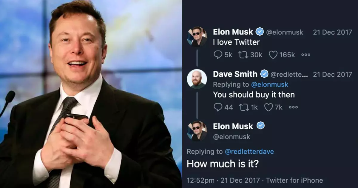 'ഐ ലവ് ട്വിറ്റർ' എന്ന് 2017 ഡിസംബർ 21 നാണ് ഇലോൺ മസ്ക് ട്വീറ്റ് ചെയ്തത്. 'അപ്പോൾ നിങ്ങളിത് വാങ്ങൂവെന്ന്' ഡേവ് സ്മിത്ത് മസ്കിന് മറുപടി നൽകി. അതിനോട് മസ്ക് തമാശയായി 'എത്രയാണിത്' എന്ന് ചോദിക്കുന്നുണ്ട്. ആ സംഭാഷണം അവിടെ അവസാനിച്ചിരുന്നു. എന്നാൽ അഞ്ചുവർഷത്തിനിപ്പുറം ഈ മാസം 16 ന് ഇലോൺ മസ്ക് ആ പഴയ ട്വീറ്റിന് കീഴിൽ തലകീഴായുള്ള സ്മൈലി ഇമോജി നൽകുകയും ചെയ്തു.