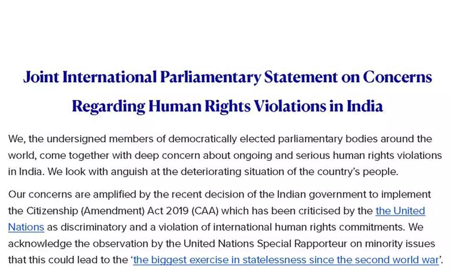അന്താരാഷ്ട്ര മനുഷ്യാവകാശ ചുമതലകളുടെ ലംഘനവും വിവേചനവുമാണെന്ന് ഐക്യരാഷ്ട്രസഭ വിമർശിച്ച പൗരത്വ ഭേദഗതി നിയമം നടപ്പാക്കാൻ ഇന്ത്യൻ സർക്കാർ അടുത്ത കാലത്ത് എടുത്ത തീരുമാനമാണ് തങ്ങളുടെ ആശങ്കകൾ ശക്തമാക്കിയിരിക്കുന്നത്. ഇന്ത്യയിൽ മുസ്ലിംകൾക്കെതിരെ വർധിച്ചുവരുന്ന വിദ്വേഷ പ്രസംഗങ്ങൾ, മതപരിവർത്തന വിരുദ്ധ നിമയങ്ങളിലൂടെയും ഗോവധ വിരുദ്ധ നിയമങ്ങളിലൂടെയും രാജ്യത്തെ ന്യൂനപക്ഷങ്ങളുടെ അവകാശങ്ങൾ ഇല്ലാതാക്കാനും അവരെ പാർശ്വവൽക്കരിക്കാനുമുള്ള ശ്രമങ്ങൾ ഞെട്ടിപ്പിക്കുന്നതാണെന്നും സംയുക്ത പ്രസ്താവനയിൽ സൂചിപ്പിച്ചു.