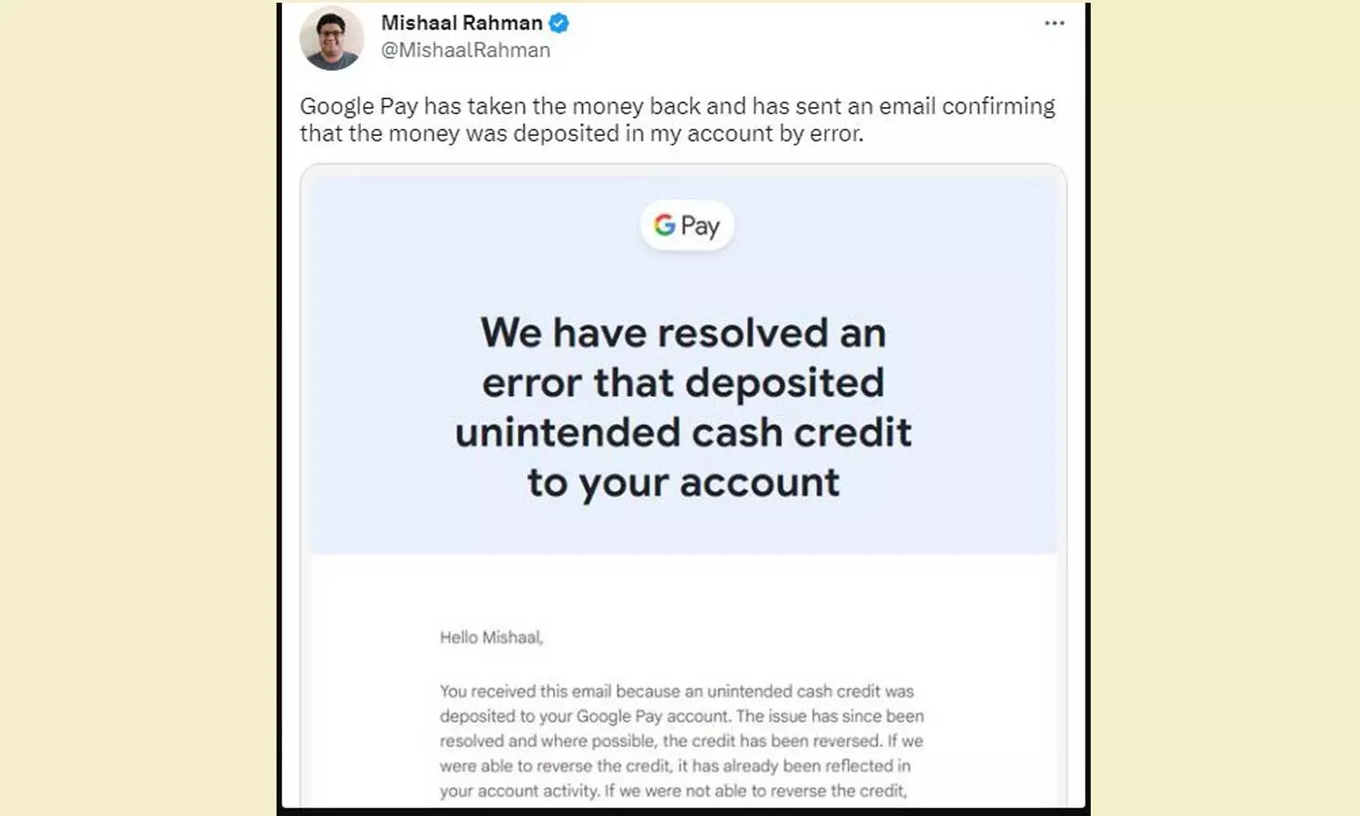 പണം ക്രെഡിറ്റായത് അബദ്ധത്തില് സംഭവിച്ചതാണെന്ന് അറിയിച്ച് ഗൂഗിൾ പേ ഉപഭോക്താക്കൾക്ക് മെയിൽ അയിച്ചു. 'പ്രശ്നം പരിഹരിച്ചിരിക്കുന്നു, സാധ്യമാകുന്ന രീതിയിൽ പണം തിരിച്ചെടുത്തിട്ടുണ്ട്. എന്നാൽ പണം ചെലവഴിക്കുകയോ കൈമാറ്റം ചെയ്യുകയോ ചെയ്തിട്ടുണ്ടെങ്കിൽ ആ പണം നിങ്ങളുടേതാണ്. അതിൽ കൂടുതൽ നടപടികൾ എടുക്കില്ല' ഗൂഗിൾ അയച്ച മെയിലിൽ പറയുന്നു.