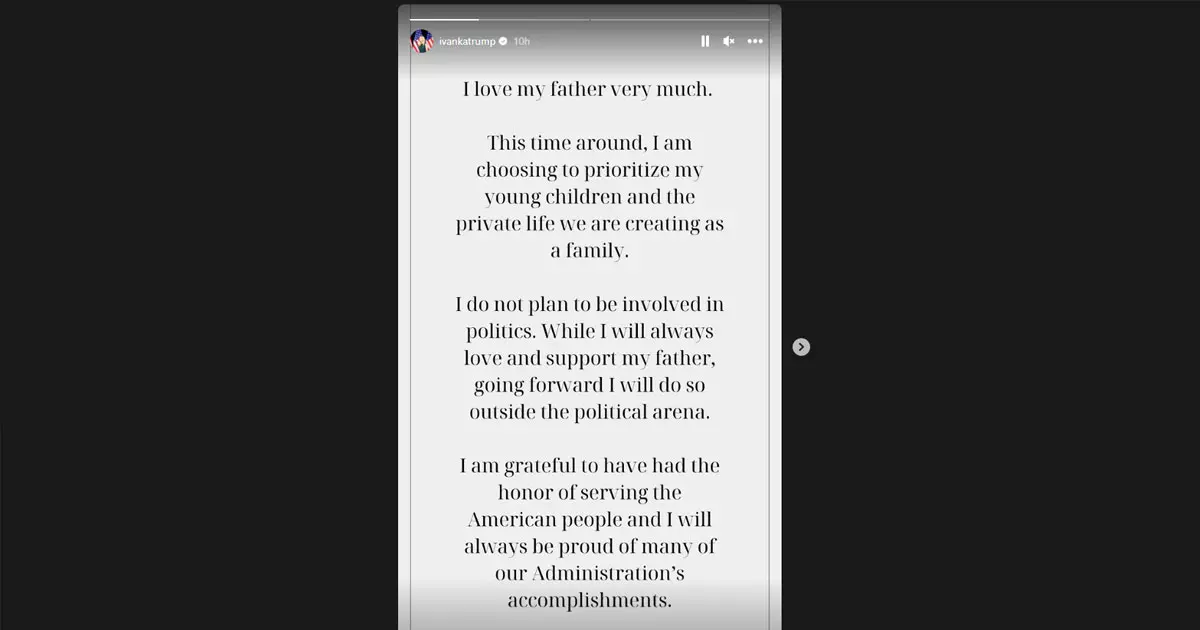 'അമേരിക്കൻ ജനതയെ സേവിച്ചതിൽ ഞാൻ നന്ദിയുള്ളവളാണ്, ഞങ്ങളുടെ ഭരണകൂടത്തിന്റെ നേട്ടങ്ങളിൽ ഞാൻ എപ്പോഴും അഭിമാനിക്കുന്നു,'' ഇവാങ്ക ട്രംപ് ഇൻസ്റ്റാഗ്രാമിൽ പറഞ്ഞു.
