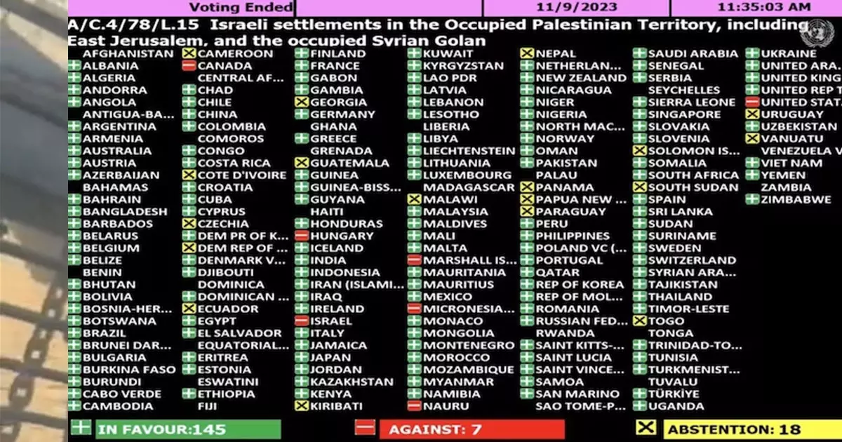 'കിഴക്കൻ ജറുസലേം ഉൾപ്പെടെ അധിനിവേശ ഫലസ്തീൻ പ്രദേശത്തും അധിനിവേശ സിറിയൻ ഗോലാനും ഉൾപ്പെടെയുള്ള ഇസ്രായേൽ സെറ്റിൽമെന്റുകൾ' എന്ന തലക്കെട്ടിലുള്ള യുഎൻ കരട് പ്രമേയം വൻ ഭൂരിപക്ഷത്തോടെയാണ് പാസാക്കിയത്. ഏഴ് രാജ്യങ്ങൾ പ്രമേയത്തെ എതിർത്തപ്പോൾ 18 രാജ്യങ്ങൾ വോട്ടെടുപ്പിൽ നിന്ന് വിട്ടുനിന്നു. യുഎസ്, കാനഡ, ഹംഗറി, ഇസ്രായേൽ, മാർഷൽ ദ്വീപുകൾ, ഫെഡറേറ്റഡ് സ്റ്റേറ്റ്സ് ഓഫ് മൈക്രോനേഷ്യ, നൗറു എന്നീ രാജ്യങ്ങളാണ് പ്രമേയത്തെ എതിർത്ത് വോട്ട് ചെയ്തത്.