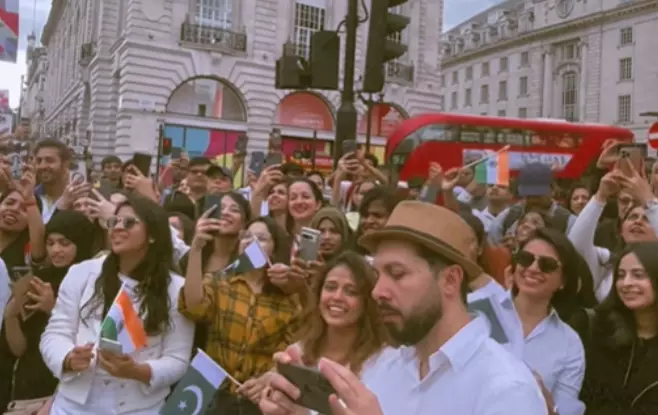 ലണ്ടനിലെ പ്രശസ്തമായ പിക്കാഡിലി സര്ക്കസില് ഒരു ഇന്ത്യന് ഗായകന് തേരി മിട്ടി', 'ജയ് ഹോ', 'മാ തുജെ സലാം', 'സന്ദേശേ ആതേ ഹേ' തുടങ്ങിയ ഗാനങ്ങള് ആലപിക്കുന്ന വീഡിയോ സോഷ്യല്മീഡിയയില് വൈറലായിട്ടുണ്ട്. വെളുത്ത വസ്ത്രങ്ങളണിഞ്ഞ് ദേശീയ പതാകയുമേന്തി നില്ക്കുന്ന ഇന്ത്യാക്കാര്ക്കൊപ്പം പാകിസ്താനികളും ചേരുന്നുണ്ട്. മാതൃരാജ്യത്തിന്റെ പതാകയും കയ്യില് പിടിച്ചാണ് ലണ്ടനിലെ പാകിസ്താനികളും ആഘോഷത്തില് പങ്കുചേര്ന്നത്. വിഷ് മ്യൂസിക് എന്ന ഇന്സ്റ്റഗ്രാം അക്കൗണ്ടില് നിന്നാണ് വീഡിയോ പങ്കുവച്ചിരിക്കുന്നത്. "ലണ്ടനിലെ പിക്കാഡിലി സർക്കസിൽ എന്നോടൊപ്പം ചേരാൻ ഞാൻ ഇന്ത്യക്കാരോടും പാകിസ്താനികളോടും ആവശ്യപ്പെട്ടു, ഇതാണ് സംഭവിച്ചത്," വിഷ് വീഡിയോയ്ക്ക് അടിക്കുറിപ്പ് നൽകി.
