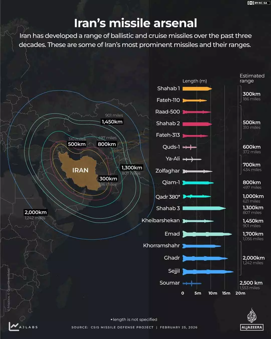 ആധുനിക വ്യോമസേനയുടെ അഭാവം തങ്ങളുടെ മിസൈൽ ശേഖരംകൊണ്ട് പരിഹരിക്കാനാണ് ഇറാൻ ശ്രമിക്കുന്നത്. പശ്ചിമേഷ്യയിലെ ഏറ്റവും വലുതും വൈവിധ്യമേറിയതുമായ മിസൈൽ ശേഖരമാണ് ഇറാന്റേതെന്ന് പ്രതിരോധ വിദഗ്ധർ വിലയിരുത്തുന്നു. 150 മുതൽ 800 കിലോമീറ്റർ വരെ പരിധിയുള്ള ഫതഹ്, സുൾഫിക്കർ, ഖിയാം-1 തുടങ്ങിയ ഹ്രസ്വദൂര മിസൈലുകൾ അയൽരാജ്യങ്ങളിലെ സൈനിക താവളങ്ങളെ തകർക്കാൻ ശേഷിയുള്ളവയാണ്.