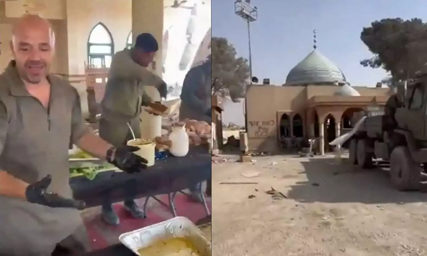 ഗസ്സയുടെയും ഈജിപ്തിന്റേയും അതിർത്തിയായ റഫയിൽ സ്ഥിതി ചെയ്യുന്ന പള്ളിക്കുള്ളിൽ കയറി മേശകളും പാത്രങ്ങളുമുൾപ്പെടെ നിരത്തി ഇസ്രായേൽ സൈനികർ ഭക്ഷണം തയാറാക്കുന്നത് വീഡിയോയിൽ കാണാം. നിരവധി ഇസ്രായേൽ സൈനികരാണ് പള്ളിക്കുള്ളിലുള്ളത്. ചിലർ ഭക്ഷണം എടുക്കുന്നതും മറ്റു ചിലർ അകത്തും പുറത്തും തോക്കുമായി നിൽക്കുന്നതും വീഡിയോയിലുണ്ട്. പള്ളിക്ക് പുറത്ത് ഇസ്രായേലി ടാങ്കുകളും നിലയുറപ്പിച്ചിട്ടുണ്ട്.