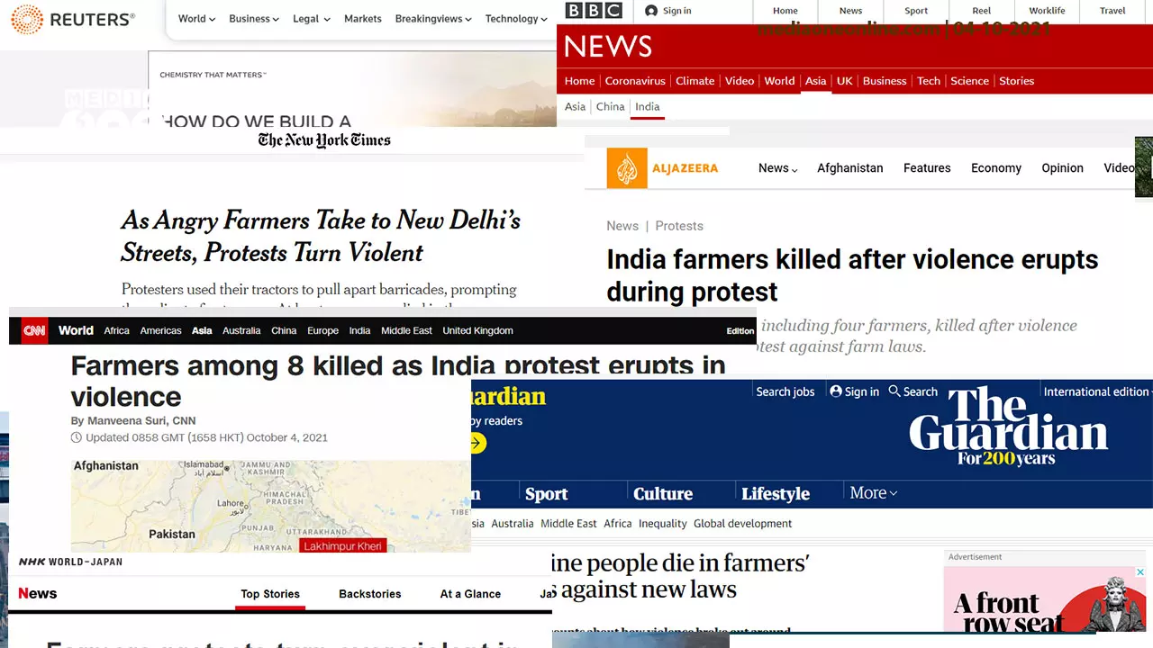 നാലു കർഷകരടക്കം ഒമ്പതുപേർ കൊല്ലപ്പെട്ട ഉത്തർപ്രദേശിലെ ലഖിംപൂർ ഖേരിയിൽ നടന്ന സംഭവം ലോകമാധ്യമങ്ങളിലും വാർത്തയായി. ബി.ബി.സി, സി.എൻ.എൻ., ന്യൂയോർക്ക് ടൈംസ്, റോയിട്ടേഴ്സ്, അൽജസീറ, ദി ഗാർഡിയൻ, എൻ.എച്ച്.കെ. വേൾഡ് ജപ്പാൻ തുടങ്ങിയ ലോകമാധ്യമങ്ങൾ വാർത്ത റിപ്പോർട്ട് ചെയ്തിട്ടുണ്ട്.