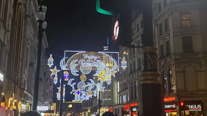 ലണ്ടൻ: ലണ്ടൻ നഗരത്തിലെ പിക്കാഡിലി സർക്കസിനേയും ലെസ്റ്റർ സ്ക്വയറിനേയും ബന്ധിപ്പിക്കുന്ന കവൻട്രി സ്ട്രീറ്റിൽ റമദാൻ ആശംസകൾ നേർന്ന് ലൈറ്റുകൾ സ്ഥാപിച്ച് അധികൃതർ. മാർച്ച് 21ന് ചൊവ്വ രാത്രിയാണ് നഗരത്തിലെ തിയേറ്റർ ജില്ലയുടെ ഹൃദയമായ പിക്കാഡിലി സർക്കസിനു (സർക്കിൾ) മുകളിൽ ലൈറ്റ് ഡിസ്പ്ലേ സ്ഥാപിച്ചത്.
