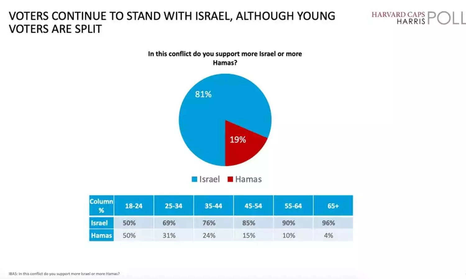|18 മുതൽ 24 വയസ് വരെ പ്രായമുള്ള അമേരിക്കക്കാരിൽ 51 ശതമാനവും അഭിപ്രായപ്പെട്ടത് ഇസ്രായേലിനെ അവസാനിപ്പിച്ച് ഭരണം ഹമാസിന് നൽകണമെന്നാണ്.