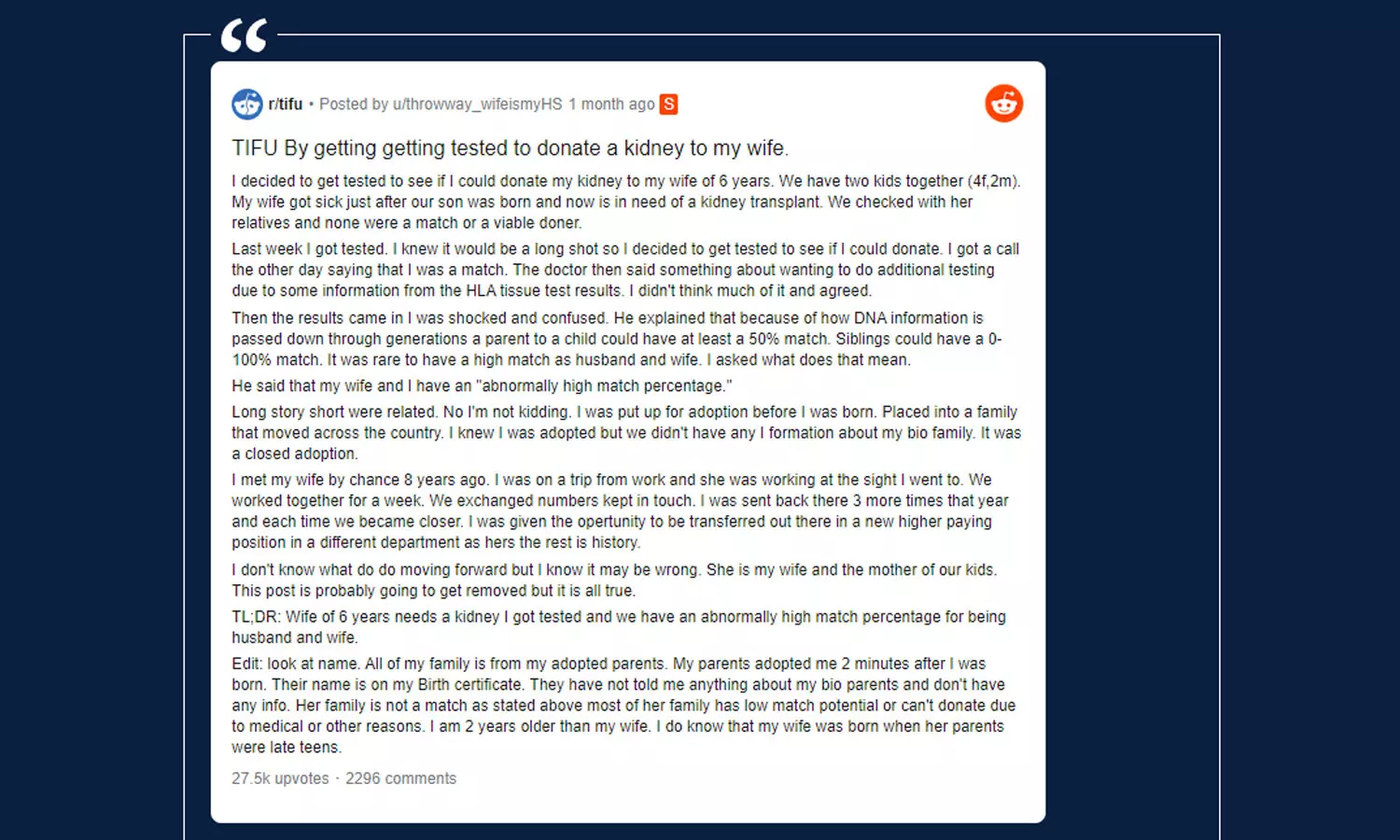 അടുത്തിടെ ഭാര്യയുടെ കിഡ്നി മാറ്റി വയ്ക്കേണ്ടതുമായി ബന്ധപ്പെട്ട് നടത്തിയ പരിശോധനയ്ക്കിടെയാണ് തങ്ങൾ രക്തബന്ധമുള്ളവരാണെന്ന് തിരിച്ചറിയുന്നതെന്നാണ് യുവാവ് കുറിപ്പിൽ പറയുന്നത്. ജനിച്ച് മിനിറ്റുകൾക്കകം ദത്ത് നൽകപ്പെട്ടയാളാണ് താനെന്നും യഥാർഥ മാതാപിതാക്കളെ കുറിച്ച് യാതൊരു വിവരവുമില്ലെന്നും യുവാവ് കൂട്ടിച്ചേർക്കുന്നു. തന്റെ രണ്ടു കുട്ടികളുടെ അമ്മയാണ് ഇപ്പോൾ തന്റെ സഹോദരിയാണെന്ന് അറിഞ്ഞിരിക്കുന്നതെന്നും ഭാര്യയോട് ഇക്കാര്യം എങ്ങനെ അവതരിപ്പിക്കുമെന്ന് അറിയില്ലെന്നും യുവാവ് കുറിപ്പിൽ ആശങ്കപ്പെടുന്നുണ്ട്.