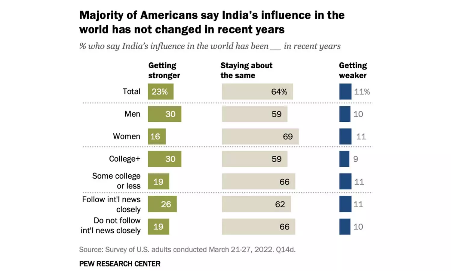 എന്നാൽ, ലോകരാഷ്ട്രീയത്തിൽ ഇന്ത്യയുടെ ശക്തിയും സ്വാധീനവും അടുത്തിടെ വളർന്നെന്ന് 23 ശതമാനം പേർ വിശ്വസിക്കുന്നു. സ്വാധീനം ദുർബലപ്പെട്ടെന്ന് 11 ശതമാനവും അഭിപ്രായപ്പെടുന്നു.