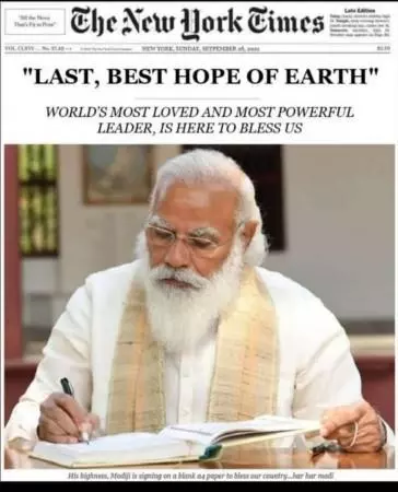 പ്രധാനമന്ത്രി നരേന്ദ്ര മോദിയുടെ അമേരിക്കൻ സന്ദർശനവുമായി ബന്ധപ്പെട്ട് ന്യൂയോർക്ക് ടൈംസ് അദ്ദേഹത്തെ അഭിനന്ദിച്ച് നൽകിയതാണെന്ന് പറഞ്ഞാണ് വ്യാജ മുഖചിത്രം പ്രചരിച്ചത്. ഗുജറാത്ത് മുൻ മന്ത്രി അടക്കം നിരവധി പേർ ഈ ചിത്രം സാമൂഹിക മാധ്യമങ്ങളിൽ പങ്കുവെച്ചിരുന്നു.