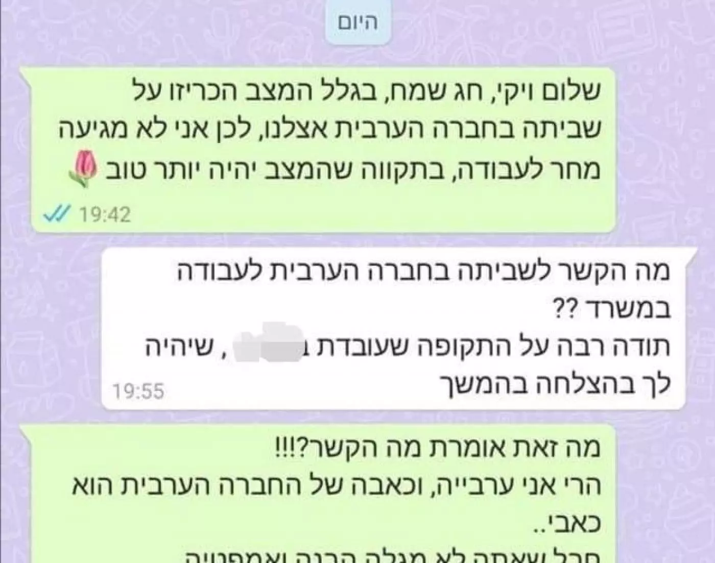 ഹീബ്രൂ ഭാഷയിലുള്ള വാട്സ് ആപ്പ് സന്ദേശങ്ങള് പുറത്തുവിട്ടുകൊണ്ട് മിഡില് ഈസ്റ്റ് ഐ ആണ് ഇക്കാര്യം റിപ്പോര്ട്ടു ചെയ്തിരിക്കുന്നത്. പൊതുപണിമുടക്ക് കാരണം ചൊവ്വാഴ്ച ജോലിക്ക് ഹാജരാകാനാകില്ലെന്ന് തൊഴിലുടമകളെ അറിയിക്കാനായി അയച്ച വാട്സ്ആപ്പ് സന്ദേശത്തിന് മറുപടിയായാണ് ഉടനെ തന്നെ അവരെ പുറത്താക്കിയെന്നുള്ള സന്ദേശം അയച്ചിരിക്കുന്നത്.