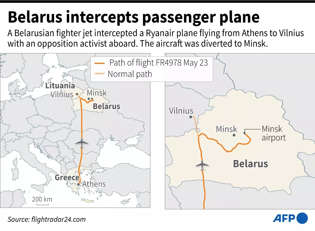 ഗ്രീസിലെ ഏതൻസിൽ നിന്ന് ലിത്വാനിയൻ തലസ്ഥാനമായ വിൽന്യുസിലേക്ക് പുറപ്പെട്ട റ്യാനെയർ വിമാനമാണ് ആകാശപാതയില് നിന്നു വഴിമാറി ബെലാറസ് തലസ്ഥാനമായ മിൻസ്കിൽ നിർബന്ധിച്ച് ഇറക്കിച്ചത്. വിമാനത്തിൽ ബോംബ് വെച്ചിട്ടുണ്ടെന്നും അടിയന്തരമായി നിലത്തിറക്കണമെന്നുമുള്ള സന്ദേശമാണ് എയര്ട്രാഫിക് കൺട്രോൾ റൂമിൽ നിന്ന് ലഭിച്ചതെന്ന് വിമാനക്കമ്പനി പിന്നീട് അറിയിച്ചു. നിര്ദേശം പാലിക്കുന്നുവെന്നുറപ്പാക്കാന് ഒരു മിഗ് 29 യുദ്ധവിമാനവും റ്യാനെയർ വിമാനത്തെ അനുഗമിച്ചിരുന്നു. യാത്രാവിമാനം മിൻസ്ക് വിമാനത്താവളത്തിൽ ഇറങ്ങിയതിനു പിന്നാലെ റോമൻ പ്രൊട്ടസെവിച്ചിനെ ബെലാറുസിയൻ സുരക്ഷാ ജീവനക്കാർ അറസ്റ്റ് ചെയ്യുകയായിരുന്നു.