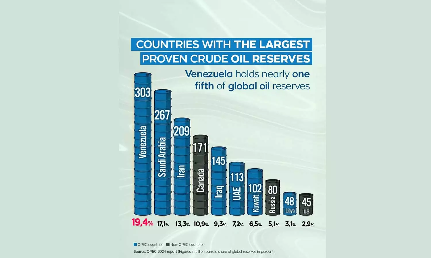 ലോകത്തിലെ ഏറ്റവും കൂടുതൽ എണ്ണനിക്ഷേപമുള്ള രാജ്യങ്ങളിലൊന്നാമതാണ് വെനസ്വേല. 303.22 ബില്യൺ ബാരലാണ് വെനസ്വേലയുടെ ക്രൂഡ് ഓയിൽ ശേഖരം. അതായത് ലോകത്തെ എണ്ണ ശേഖരത്തിന്റെഅഞ്ചിലൊന്നും വഹിക്കുന്നത് വെനസ്വേലയാണെന്ന് സാരം (19.4 ശതമാനം). ഈ എണ്ണ സമ്പത്തിലാണ് അമേരിക്കയുടെ കണ്ണ്. ആക്രമണത്തിന് ശേഷം ട്രംപ് പറഞ്ഞ കാര്യങ്ങൾ ഇത് ശരിവയ്ക്കുന്നു. വാർത്താസമ്മേളനത്തിൽ അധിനിവേശ ലക്ഷ്യങ്ങൾ തുറന്നുപറഞ്ഞ ട്രംപ് യുഎസ് എണ്ണക്കമ്പനികൾ വെനസ്വേലയിലെത്തുമെന്നും പ്രഖ്യാപിച്ചു. ആവശ്യമെങ്കിൽ ഇനിയും ആക്രമിക്കുമെന്നും ട്രംപ് വ്യക്തമാക്കി. അമേരിക്കയുടെ ലക്ഷ്യം വെനസ്വേലയിലെ എണ്ണയാണെന്ന് അടിവരയിടുന്നതാണ് ട്രംപിന്റെ ഈ വാക്കുകൾ.