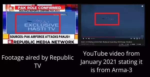 അഫ്ഗാന് കീഴടക്കിയ താലിബാന് പാകിസ്താന് സൈനികരുടെ സഹായം ലഭിക്കുന്നുണ്ടെന്ന സ്ഥിരീകരിക്കാത്ത വാര്ത്ത നിരവധി ഇന്ത്യന് വാര്ത്താ ഔട്ട് ലെറ്റുകള് റിപ്പോര്ട്ട് ചെയ്തിരുന്നു. ഇതേ വാര്ത്തയാണ് റിപ്പബ്ലിക് ടി.വിയും ചാനലിലൂടെ സംപ്രേഷണം ചെയ്തത്. 'പഞ്ച്ശീറിനെതിരെ താലിബാന്, പാകിസ്താന് സൈനികരുടെ സഹായത്തോടെ ആക്രമിക്കുന്നു' എന്ന അടിക്കുറുപ്പോടെയാണ് ചാനല് വാര്ത്ത പങ്കുവെച്ചത്. സംപ്രേഷണത്തിനിടെ അവതാരകന് തുടര്ച്ചയായി തന്നെ ദൃശ്യങ്ങള് പഞ്ച്ശീറില് നിന്നുള്ളതാണെന്നും ആക്രമിക്കുന്നത് പാകിസ്താനി വായുസേനയാണെന്നും അവകാശപ്പെടുന്നുണ്ടായിരുന്നു.