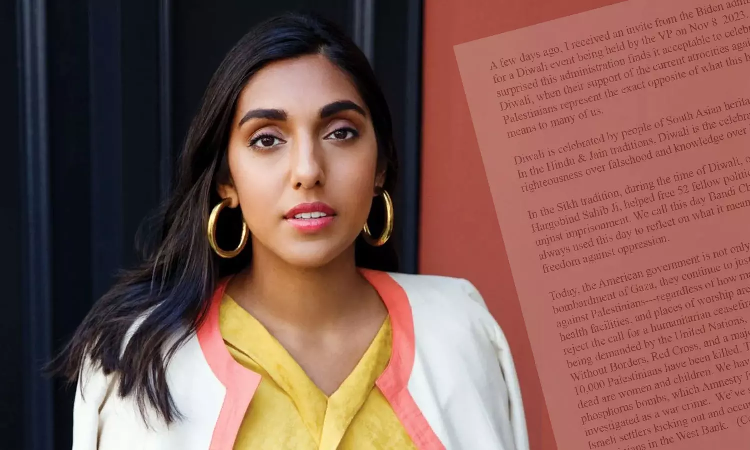 കുറച്ചു ദിസങ്ങൾക്ക് മുമ്പ്, 2023 നവംബർ എട്ടിന് വൈസ് പ്രസിഡണ്ട് (കമല ഹാരിസ്) ആതിഥേയത്വം വഹിക്കുന്ന ദീപാവലി ചടങ്ങിൽ പങ്കെടുക്കാനുള്ള ബൈഡൻ ഭരണകൂടത്തിന്റെ ക്ഷണം ലഭിച്ചു. ഫലസ്തീനിൽ നിലവിൽ നടക്കുന്ന നിഷ്ഠുരതകളെ പിന്തുണയ്ക്കുന്ന വേളയിൽ തന്നെ ദീപാവലി ആഘോഷിക്കാനുള്ള ഭരണകൂട തീരുമാനം എന്നെ ആശ്ചര്യപ്പെടുത്തി. ദീപാവലി ആഘോഷം അവരുടെ നിലപാടിന്റെ നേരെ എതിരാശയം പ്രകാശിപ്പിക്കുന്നതാണ്.