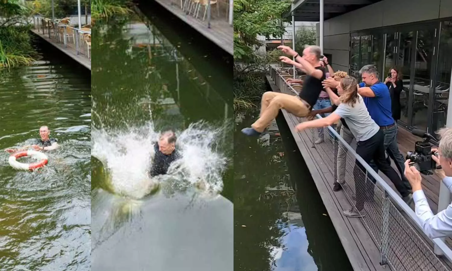 നൊബേൽ ജേതാവിനെ കുളത്തിലേക്ക് തള്ളിയിട്ടു; ആഘോഷമാക്കി സഹപ്രവർത്തകർ