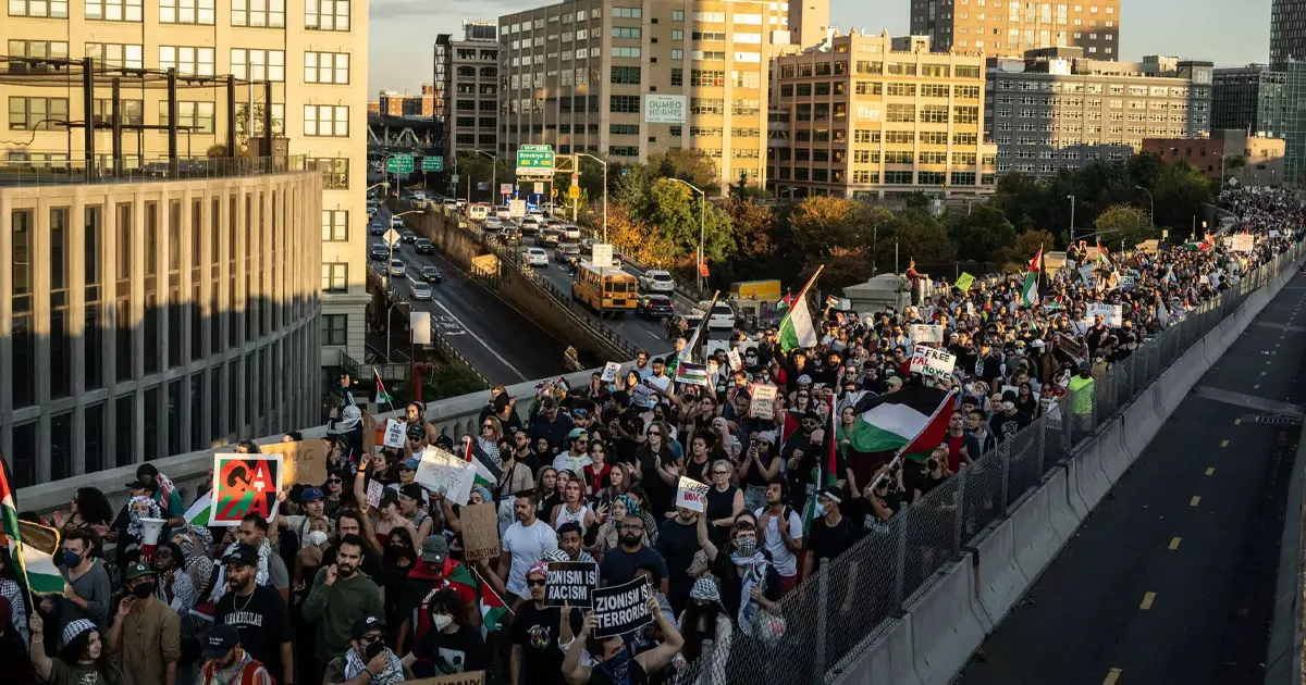 ന്യൂയോർക്ക് സിറ്റിയിലെ ബ്രൂക്ലിൻ ബ്രിഡ്ജിൽ നടന്ന ഫലസ്തീൻ അനുകൂല പ്രകടനം
