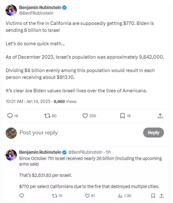 'കാലിഫോർണിയയിലെ അഗ്നിബാധയുടെ ഇരകൾക്ക് 770 ഡോളർ വീതമാണ് ലഭിക്കാൻ പോകുന്നത്. ബൈഡൻ 800 കോടി ഡോളറാണ് ഇസ്രായേലിന് അയക്കുന്നത്. 2023 ഡിസംബറിലെ കണക്കുപ്രകാരം ഇസ്രായേലിലെ ജനസംഖ്യ ഏതാണ്ട് 9,842,000 ആണ്. 800 കോടിയെ ഇസ്രായേലിലെ ഓരോ വ്യക്തിക്കുമായി വീതിച്ചാൽ ഓരോരുത്തർക്കും 813.10 ഡോളർ ലഭിക്കും. ജോ ബൈഡൻ അമേരിക്കയിലെ ജീവിതങ്ങളേക്കാൾ പ്രാധാന്യം നൽകുന്നത് ഇസ്രായേലിനാണ്.' ബെഞ്ചമിൻ റൂബിൻസ്റ്റീൻ എന്നയാൾ എക്സിൽ കുറിച്ചു.