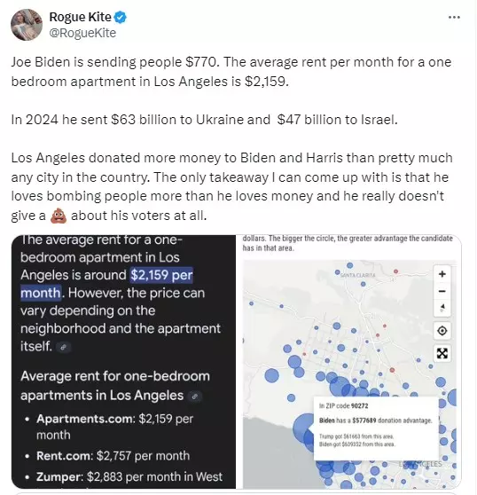 ബൈഡൻ നൽകിയ 770 ഡോളർ ലോസ് ആഞ്ചൽസിലെ ഒരു മാസത്തെ വീട്ടുവാടകയ്ക്കു പോലും തികയില്ലെന്ന് റോഗ് കൈറ്റ് എന്നയാൾ ചൂണ്ടിക്കാട്ടുന്നു.