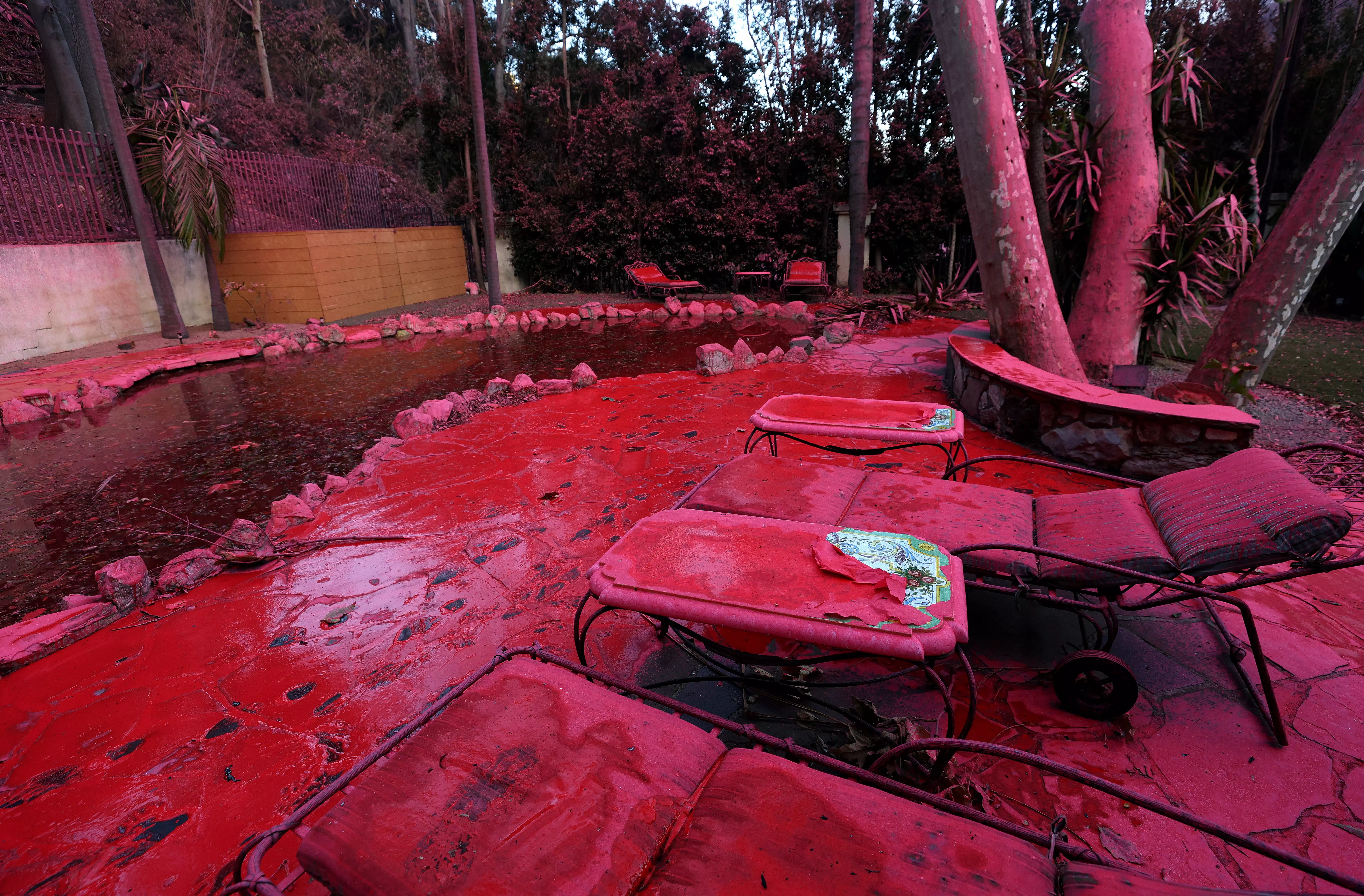 ലോസ് ഏഞ്ചൽസിലെ മേൽക്കൂരകളിലും വാഹനങ്ങളിലും തെരുവുകളിലും വ്യാപകമായി ഈ പിങ്ക് പൊടിയിപ്പോൾ കാണാം. 1960-കൾ മുതൽ യുഎസിലുടനീളം വ്യാപകമായി ഉപയോഗിച്ചിരുന്ന ഫയർ റിട്ടാർഡൻ്റായ ഫോസ്-ചെക്ക് ആണ് ഈ പദാർത്ഥം. കാലിഫോര്ണിയ ഫോറസ്ട്രി ആന്ഡ് ഫയര് പ്രൊട്ടക്ഷന് വിഭാഗം വ്യാപകമായി ഉപയോഗിച്ച് വരുന്ന ഈ പദാർത്ഥം നിർമ്മിക്കുന്നത് പെരിമീറ്റർ സൊല്യൂഷൻസ് എന്ന കമ്പനിയാണ്. അസോസിയേറ്റഡ് പ്രസ്സിൻ്റെ 2022 ലെ റിപ്പോർട്ട് അനുസരിച്ച്, ലോകത്ത് ഏറ്റവും കൂടുതൽ ഉപയോഗിക്കുന്ന അഗ്നിശമന മരുന്നാണ് ഫോസ്-ചെക്ക്.