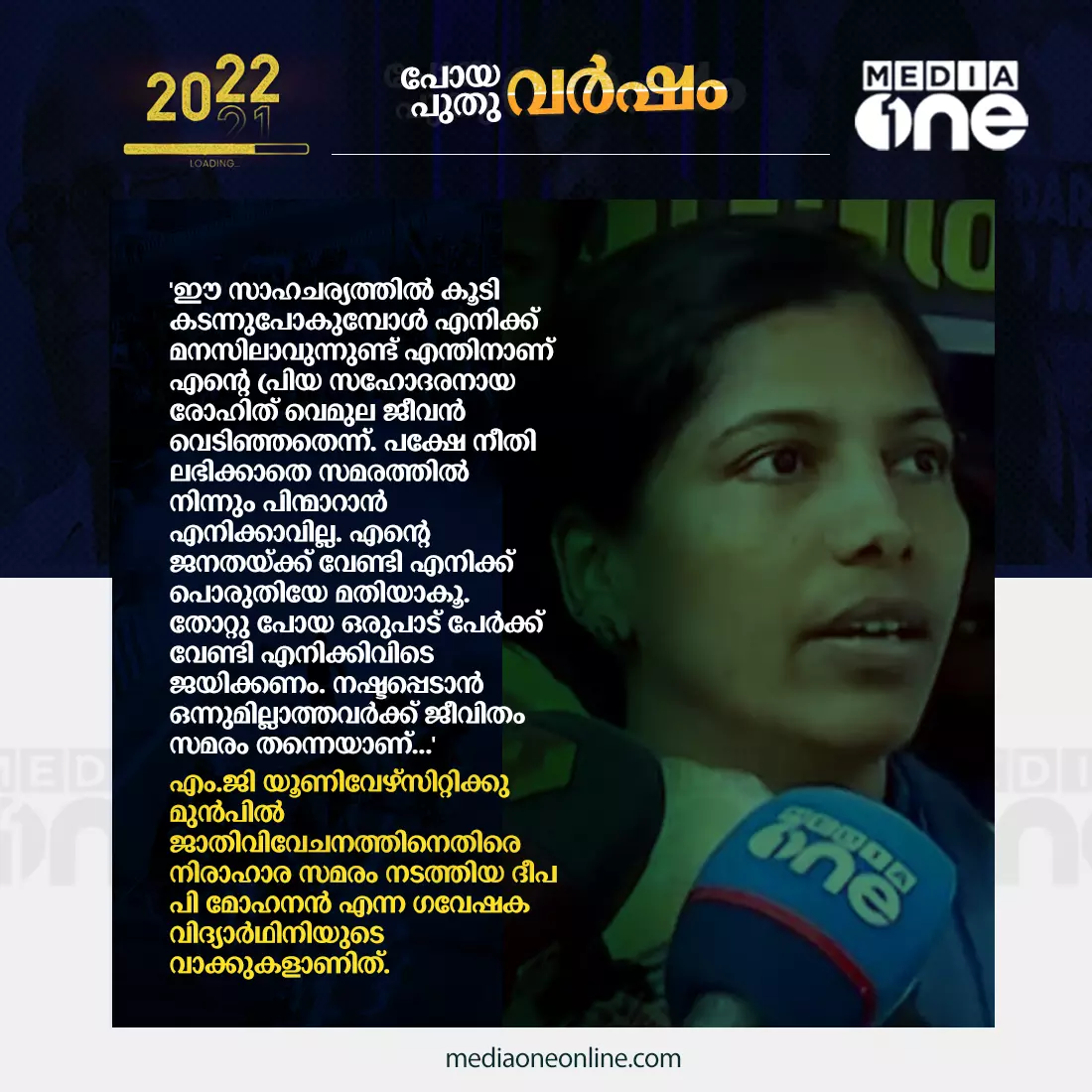 'ഈ സാഹചര്യത്തിൽ കൂടി കടന്നുപോകുമ്പോൾ എനിക്ക് മനസിലാവുന്നുണ്ട് എന്തിനാണ് എൻറെ പ്രിയ സഹോദരനായ രോഹിത് വെമുല ജീവൻ വെടിഞ്ഞതെന്ന്. പക്ഷേ നീതി ലഭിക്കാതെ സമരത്തിൽ നിന്നും പിന്മാറാൻ എനിക്കാവില്ല. എൻറെ ജനതയ്ക്ക് വേണ്ടി എനിക്ക് പൊരുതിയേ മതിയാകൂ. തോറ്റു പോയ ഒരുപാട് പേർക്ക് വേണ്ടി എനിക്കിവിടെ ജയിക്കണം. നഷ്ടപ്പെടാൻ ഒന്നുമില്ലാത്തവർക്ക് ജീവിതം സമരം തന്നെയാണ്'- എം.ജി യൂണിവേഴ്സിറ്റിക്കു മുൻപിൽ ജാതിവിവേചനത്തിനെതിരെ നിരാഹാര സമരം നടത്തിയ ദീപ പി മോഹനൻ എന്ന ഗവേഷക വിദ്യാർഥിനിയുടെ വാക്കുകളാണിത്. 2011ൽ നാനോ സയൻസിൽ എംഫിലിന് പ്രവേശം നേടിയ ശേഷം 2014ലാണ് ദീപ ഗവേഷണം തുടങ്ങിയത്. ദലിത് വിദ്യാർഥിനിയായതുകൊണ്ടുമാത്രം ഗവേഷണത്തിന് സൗകര്യം പോലും നൽകാതെ വിവേചനം കാണിച്ച നാനോ സയൻസ് മേധാവി നന്ദകുമാർ കളരിക്കലിനെ പുറത്താക്കണമെന്നും തനിക്ക് അനുകൂലമായ കോടതി വിധി നടപ്പാക്കണമെന്നുമായിരുന്നു ദീപയുടെ ആവശ്യങ്ങൾ. ലാബ് സൗകര്യം, ഹോസ്റ്റൽ സൗകര്യം, തടഞ്ഞുവെച്ച ഫെല്ലോഷിപ്പ് തുക ലഭ്യമാക്കുക, എക്സ്റ്റൻഷൻ ഫീ ഇല്ലാതെ വർഷം നീട്ടിനൽകുക എന്നീ ആവശ്യങ്ങളുന്നയിച്ച് ദീപ നടത്തിയ നിരാഹാര സമരത്തിന് മുന്നിൽ പതിനൊന്നാം ദിവസമാണ് അധികൃതർ മുട്ടുമടക്കിയത്.
