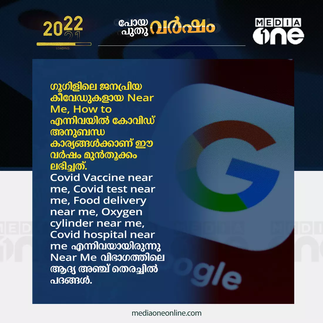 ഗൂഗിളിലെ ജനപ്രിയ കീവേഡുകളായ Near Me, How to എന്നിവയിൽ കോവിഡ് അനുബന്ധ കാര്യങ്ങൾക്കാണ് ഈ വർഷം മുൻതൂക്കം ലഭിച്ചത്. Covid Vaccine near me, Covid test near me, Food delivery near me, Oxygen cylinder near me, Covid hospital near me എന്നിവയായിരുന്നു Near Me വിഭാഗത്തിലെ ആദ്യ അഞ്ച് തെരച്ചിൽ പദങ്ങൾ. How to register for Covid vaccine, How to download vaccination certificate, How to increase oxygen level, How to link PAN with AADHAAR, How to make oxygen at home എന്നിവയാണ് ഈ ഗണത്തിൽ മുന്നിട്ടു നിന്നത്.