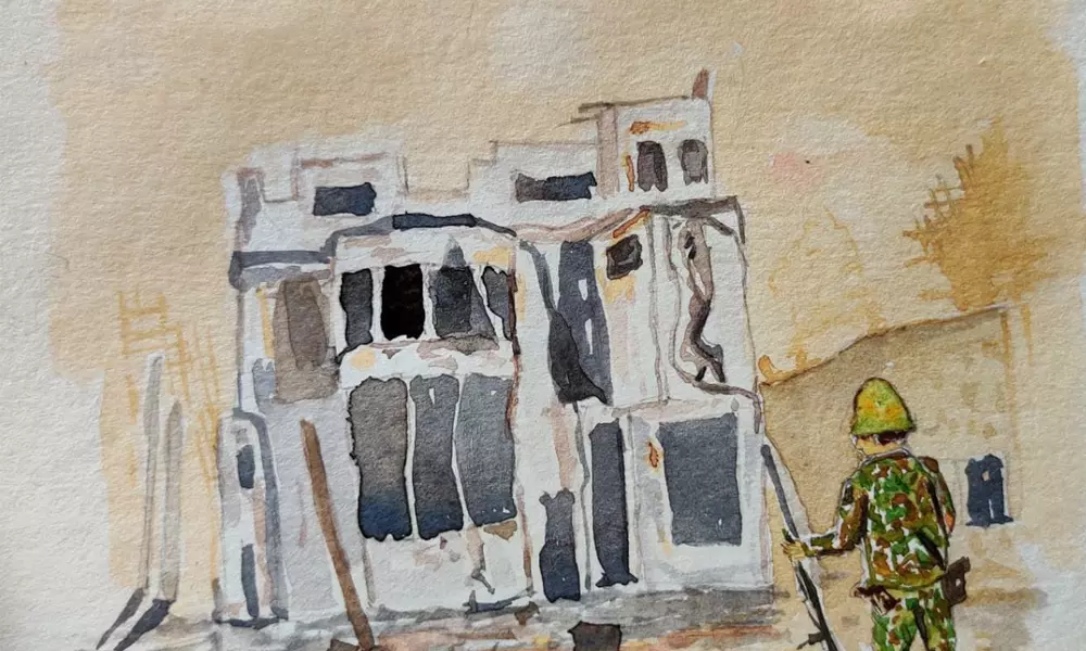 ബാമിയാനിലെ പഴയ ബുദ്ധശിൽപങ്ങളെ ഓർമിപ്പിക്കും വിധം തലയെടുപ്പോടെ രണ്ടു പട്ടാളക്കാർ ജോർജിന് മുന്നിൽ നിന്നു. ജോർജിന്റെ പൊടി പിടിച്ച മുഖത്ത് വിയർപ്പ് തുള്ളികൾ കുഴഞ്ഞ് ചെളിയായി. അതവിടെ വികൃതമായ ഭൂപടങ്ങൾ വരച്ചു. ഒരു പട്ടാളക്കാരൻ ജോർജിന് മുന്നിൽ മുട്ടുകുത്തിയിരുന്നു. അയാളുടെ ബൂട്ടിൽ രക്തം ഉണങ്ങി കറുത്ത് കിടന്നു. അയാൾ പല്ലു കടിച്ചുകൊണ്ട് പതിയെ പറഞ്ഞു,