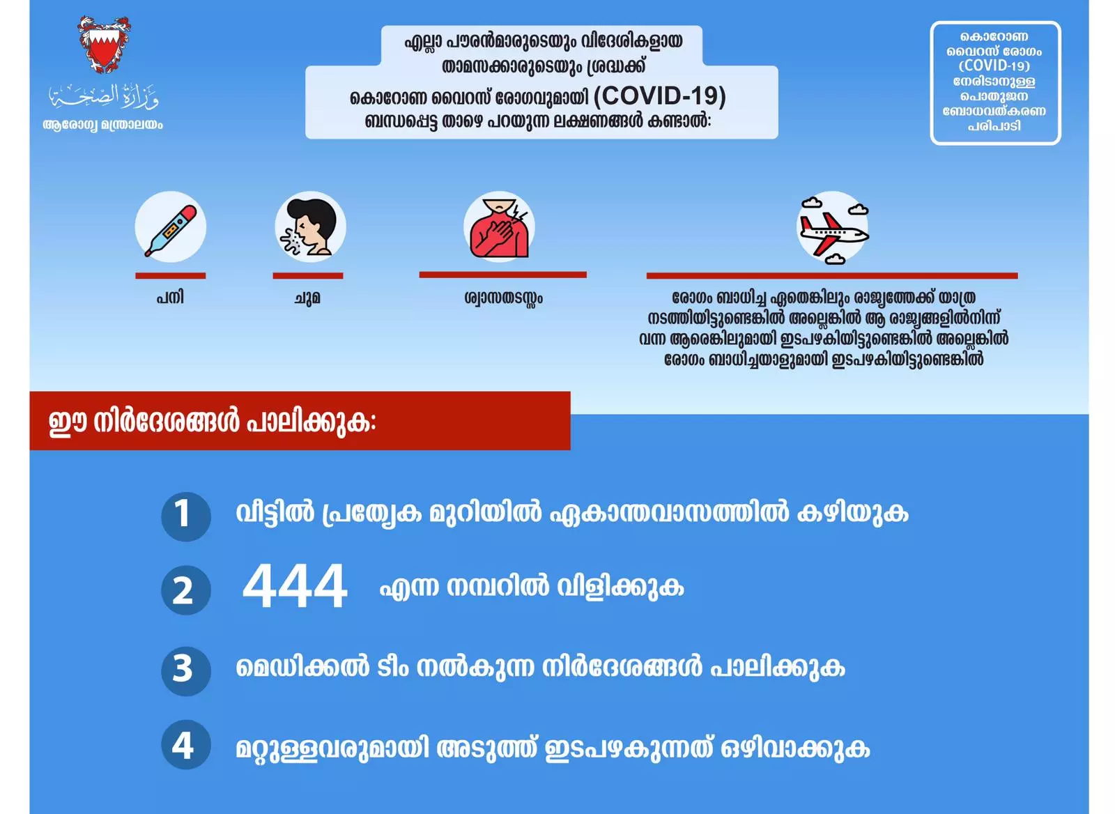 കൊറോണ വൈറസ് ബാധയുടെ പശ്ചാത്തലത്തിൽ ബഹ് റൈൻ ആരോഗ്യമന്ത്രാലയം രാജ്യ നിവാസികൾക്ക് നൽകിയ നിർദേശങ്ങൾ ഇവയാണ്.