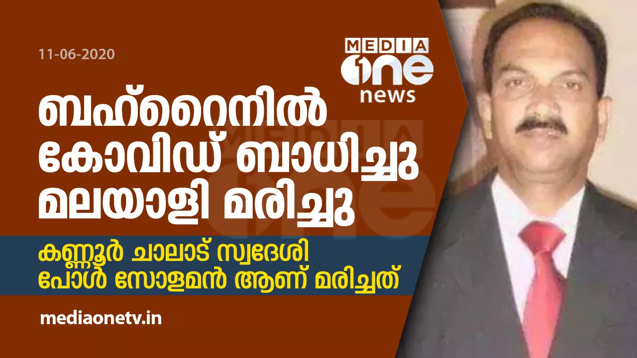 ബഹ്റൈനിൽ കോവിഡ് ബാധിച്ച് മലയാളി മരിച്ചു. പൊലീസ് മ്യൂസിക് ബാൻഡിലെ സീനിയർ മ്യൂസീഷ്യനും കണ്ണൂർ ചാലാട് സ്വദേശിയുമായ പോൾ സോളമൻ (61) ആണ് മരിച്ചത്. ഒരാഴ്ച്ച മുമ്പാണ് രോഗം സ്ഥിരീകരിച്ചത്. ബി.ഡി.എഫ് ഹോസ്പിറ്റലിൽ ചികിത്സയിൽ കഴിയവേ വ്യാഴാഴ്ച പുലർച്ചെയാണ് മരണം. കേരള പൊലീസിലും ഇദ്ദേഹം ജോലി ചെയ്തിരുന്നു. മങ്ങാട്ടുപറമ്പ് പൊലീസ് മ്യൂസിക് ബാൻഡിലെ അംഗമായിരുന്നു. ഭാര്യ: ലിനി. (അധ്യാപിക). മകൻ: റെയ്ഗൻ (യു കെയിൽ സൗണ്ട് എഞ്ചിനീയറിംഗ് വിദ്യാർത്ഥി).