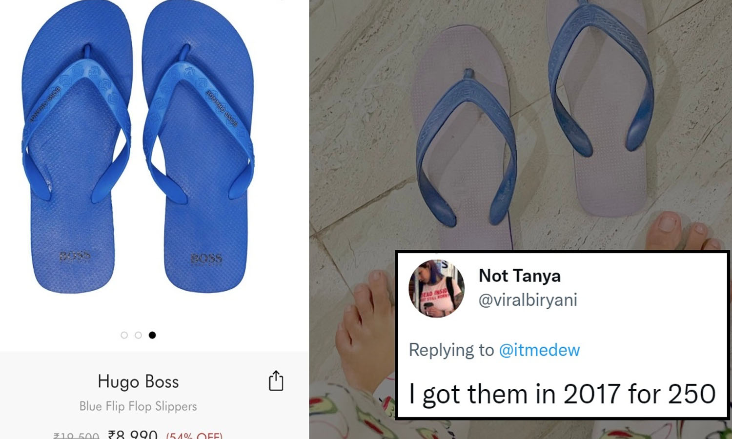 ഇങ്ങനെ ഒരു ഉൽപന്നം അവതരിപ്പിച്ചതിന് പിന്നാലെ എയറിലായിരിക്കുകയാണ് ആഡംബര ബ്രാൻഡായ ഹ്യൂഗോ ബോസ്. കമ്പനിയുടെ ഒരു ജോഡി ചെരുപ്പാണ് ഇപ്പോൾ ട്വിറ്ററിലെ ചർച്ചാ വിഷയം. സാധാരണയായി വീടിനുള്ളിൽ ഉപയോഗിക്കുന്ന തരം നീല നിറത്തിലുള്ള ചെരുപ്പിന് ഹ്യൂഗോ ബോസ് വിലയിട്ടിരിക്കുന്നത് 8,990 രൂപ.