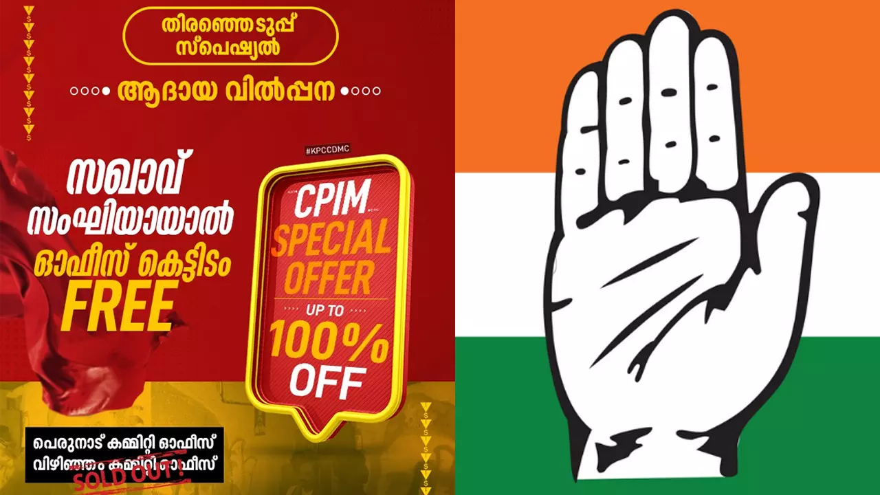 സിപിഐഎമ്മിനെ പരസ്യമായി ട്രോളി കോണ്ഗ്രസ് കേരള ഫേസ്ബുക്ക് പേജ്. 'സഖാവ് സംഘിയായാല് ഓഫീസ് കെട്ടിടം ഫ്രീ’ എന്ന തലക്കെട്ടോടെ തയ്യാറാക്കിയ പോസ്റ്ററാണ് കോണ്ഗ്രസിന്റെ ഔദ്യോഗിക ഫേസ്ബുക്ക് പേജ് പുറത്തിറക്കിയത്. 'തെരഞ്ഞെടുപ്പ് സ്പെഷ്യല്, ആദായ വില്പ്പന' എന്ന ടാഗ് ലൈനോടെ നൂറ് ശതമാനം 'ഓഫ്' വാഗ്ദാനം നല്കുന്ന പോസ്റ്ററില് സി.പി.ഐ.എം പെരുനാട്, വിഴിഞ്ഞം ഓഫീസുകള് വിറ്റഴിച്ചതായും പരിഹസിക്കുന്നു.