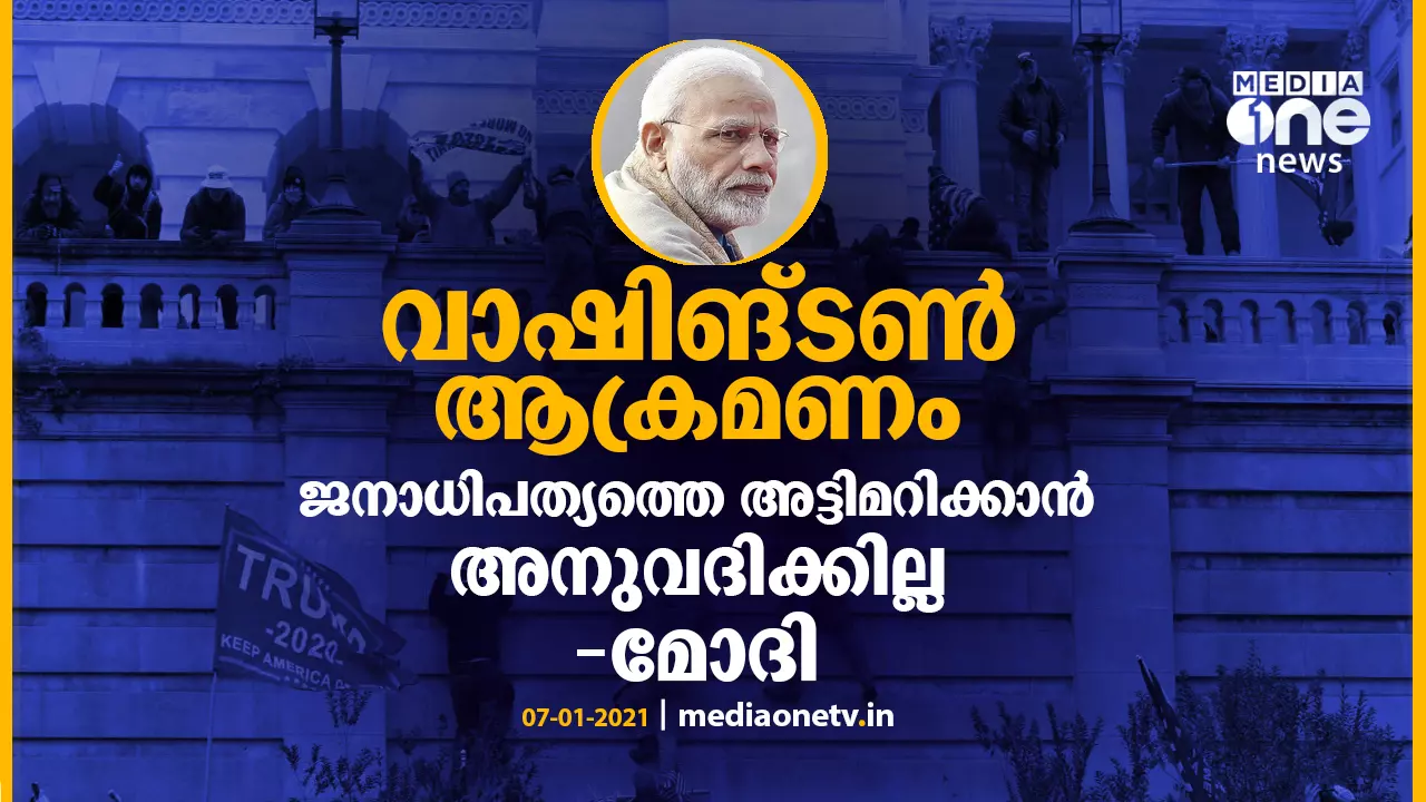ബുധനാഴ്ച വാഷിങ്ടണിലെ ക്യാപ്പിറ്റോളിൽ ട്രംപ് അനുകൂലികൾ നടത്തിയ ആക്രമണത്തെ അപലപിച്ച് പ്രധാന മന്ത്രി നരേന്ദ്ര മോദി. "വാഷിംഗ്ടണിലുണ്ടായ അക്രമ സംഭവങ്ങളുടെ വാര്ത്തകള് ഏറെ വേദനിപ്പിച്ചു. നിയമവിരുദ്ധമായ പ്രതിഷേധങ്ങളിലൂടെ ജനാധിപത്യ പ്രക്രിയയെ അട്ടിമറിക്കാനാവില്ല, ചിട്ടയോടും സമാധാനപരമായും അധികാര കൈമാറ്റം നടത്തണം" പ്രധാനമന്ത്രി ട്വിറ്ററിൽ കുറിച്ചു.