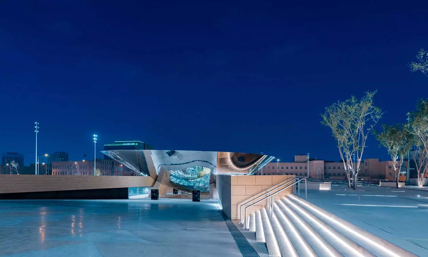 This station, which features a design that blends tradition and modernity, will cater to administrative facilities, palaces, squares, historical markets, commercial centers, and tourist sites, benefiting residents in the Qasr Al Hokm district in Riyadh. According to the Saudi Press Agency, the main highlight is the striking stainless-steel canopy that visually connects the station’s multiple levels with its external surroundings, allowing daylight to illuminate the interior while providing shade to the surrounding open areas. Qasr Al Hokm Station consists of seven floors and is equipped with 17 elevators, 46 escalators, and numerous shops and services.
