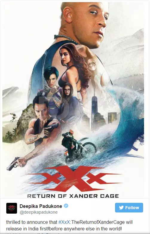 നേരത്തെ ജനുവരി 20ന് ചിത്രം അമേരിക്കയില് റിലീസ് ചെയ്യാനായിരുന്നു പദ്ധതിയിട്ടിരുന്നത്. എന്നാല് ദിപീകയുടെ സാന്നിധ്യം ഉള്ളതിനാല് ഇന്ത്യയില് റിലീസ് ചെയ്യാന് തീരുമാനിക്കുകയായിരുന്നു. ഇതാദ്യമായല്ല ഹോളീവുഡ് ചിത്രം ഇന്ത്യയില് റിലീസിനെത്തുന്നത്. ഇര്ഫാന് ഖാന് അഭിനയിച്ച ഹോളീവുഡ് ചിത്രം ഇന്ഫെര്നോയും ജംഗിള് ബുക്കും ഇന്ത്യയിലാണ് ആദ്യം റിലീസ് ചെയ്തത്. ഡിജെ കറുസോ സംവിധാനം ചെയ്യുന്ന ത്രിപിള് എക്സ്: ദ റിട്ടേണ് ഓഫ് എക്സാന്ഡര് കേജില് വിന് ഡീസല് ആണ് കേന്ദ്ര കഥാപാത്രമാകുന്നത്. ഡോണി യെന്, നിന ഡോബ്രേവ്, റൂബി റോസ്, സാമുവല് എല് ജാക്സണ് എന്നിവരാണ് കേന്ദ്രകഥാപാത്രങ്ങളായി എത്തുന്നത്.