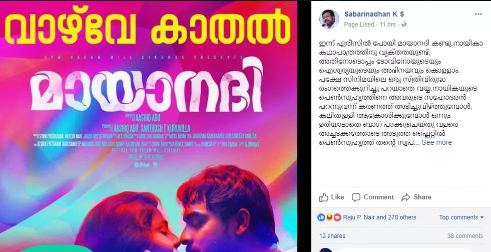 ആഷിക് അബുവിന്റെ മായാനദി പ്രേക്ഷകരുടേയും നിരൂപകരുടേയും പ്രശംസ പിടിച്ചു പറ്റി മുന്നേറുകയാണ്. ഇതിനിടെ ചിത്രത്തിലെ ഒരു രംഗം തീര്ത്തും സ്ത്രീവിരുദ്ധമാണെന്ന് പറഞ്ഞാണ് കെഎസ് ശബരീനാഥന് എംഎല്എ രംഗത്തെത്തിയിരിക്കുന്നത്. റിവ്യൂകള് ധാരാളം കണ്ടെങ്കിലും അതിലൊന്നും ഈ രംഗത്തെക്കുറിച്ച് പരാമര്ശിച്ചു കണ്ടില്ലെന്നും അദ്ദേഹം പറയുന്നു.