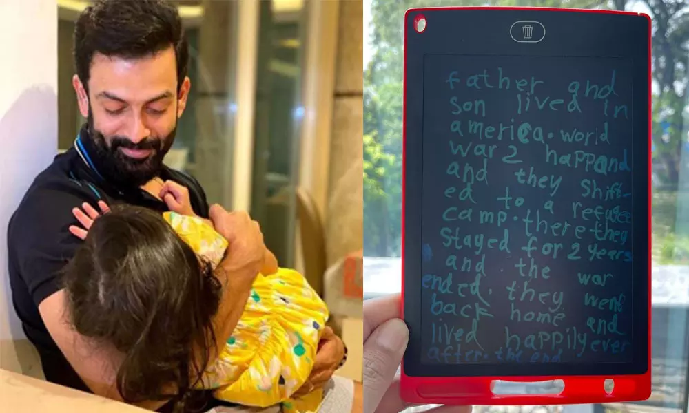 അല്ലിയുടെ കഥകള് എന്ന ഹാഷ് ടാഗോടെ മകളുടെ ഇ സ്ലേറ്റിലെ കുഞ്ഞുകഥയാണ് പൃഥിരാജ് പങ്കുവെച്ചത്.