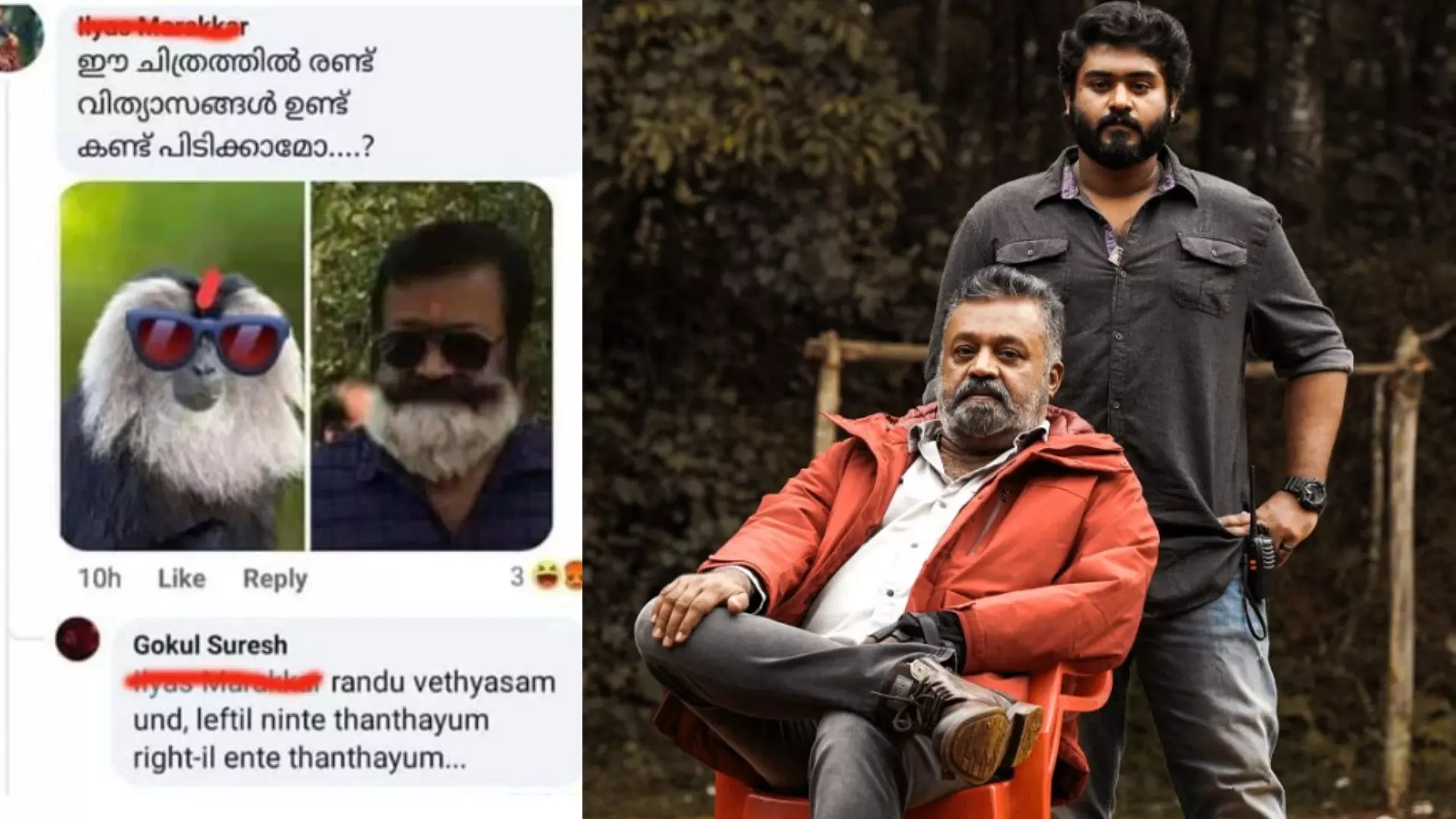 സുരേഷ് ഗോപിയുടെയും സിംഹവാലൻ കുരങ്ങിൻറെയും ഫോട്ടോകൾ ചേർത്തുവെച്ച് 'ഈ ചിത്രത്തിന് രണ്ട് വ്യത്യാസങ്ങളുണ്ട് കണ്ടുപിടിക്കാമോ' എന്നായിരുന്നു ഒരാളുടെ കുറിപ്പ്