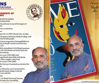 1994 ഡിസംബറില് ഇറക്കിയ ടൈം മാഗസിന്റെ കവറിലാണ് തന്റെ സ്വന്തം ചിത്രം നൈസായി ചേര്ത്ത് കണ്ണന്താനത്തിന്റെ പ്രചാരണം. ലോകമെമ്പാടുമുള്ള 100 യുവനേതാക്കളെക്കുറിച്ച് ടൈം മാഗസിന് തയാറാക്കിയ പ്രത്യേക ലക്കത്തിന്റെ കവര്ഫോട്ടായിലാണ് ഫോട്ടോഷോപ്പ് പ്രയോഗം. അണികളാരെങ്കിലും ആവേശം മൂത്ത് ചെയ്തതാണെന്നും കരുതണ്ട. സ്വന്തം പേരിലുള്ള വേരിഫൈഡ് പ്രൊഫൈലില് തന്നെയാണ് ഫോട്ടോ പോസ്റ്റ് ചെയ്തിരിക്കുന്നത്.