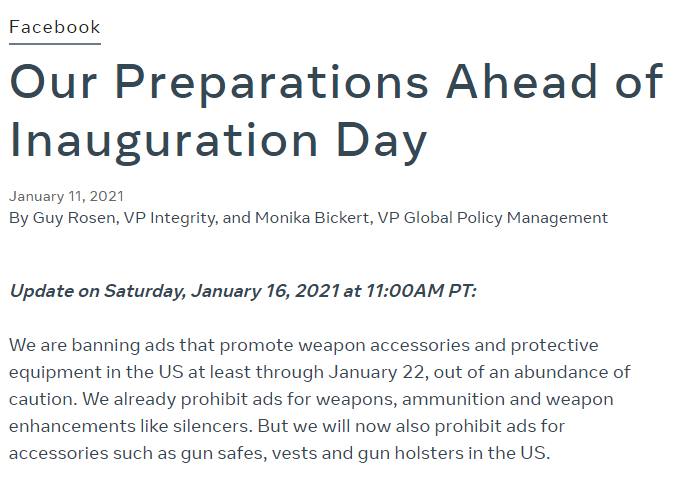 " ആയുധ ഉപകരണങ്ങൾ പ്രോത്സാഹിപ്പിക്കുന്ന പരസ്യങ്ങൾ ജനുവരി 22 വരെ മുൻകരുതലെന്നോണം ഞങ്ങൾ വിലക്കുകയാണ്. " ഫേസ്ബുക് പ്രസ്താവനയിൽ പറഞ്ഞു.
