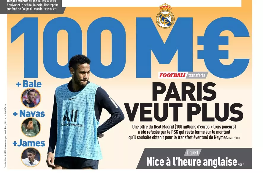നെയ്മറിനെ വാങ്ങുന്നതിനായി റയൽ മുന്നോട്ടുവെക്കുകയും പി.എസ്.ജി നിരസിക്കുകയും ചെയ്ത ഓഫറിന്റെ വിശദാംശങ്ങൾ സ്പാനിഷ് പത്രം എൽ എക്വിപെ പുറത്തുവിട്ടത് എല്ലാവരെയും ഞെട്ടിച്ചിരിക്കുകയാണ്. 100 ദശലക്ഷം യൂറോയും ഒപ്പം സ്ട്രൈക്കർ ഗാരത് ബെയ്ൽ, ഗോൾകീപ്പർ കെയ്ലർ നവാസ്, മിഡ്ഫീൽഡർ ഹാമിസ് റോഡ്രിഗസ് എന്നിവരെയും നൽകാം എന്ന് റയൽ വ്യക്തമാക്കിയെങ്കിലും പി.എസ്.ജി അത് നിരസിക്കുകയായിരുന്നുവത്രേ. ഫുട്ബോൾ ലോകത്ത് മേൽവിലാസമുണ്ടാക്കിയ മൂന്ന് താരങ്ങളെയും ഒപ്പം 100 ദശലക്ഷം യൂറോയും വേണ്ടെന്നു വെക്കാൻ പി.എസ്.ജി കണ്ട കാരണം എന്താണെന്നു വ്യക്തമല്ല.