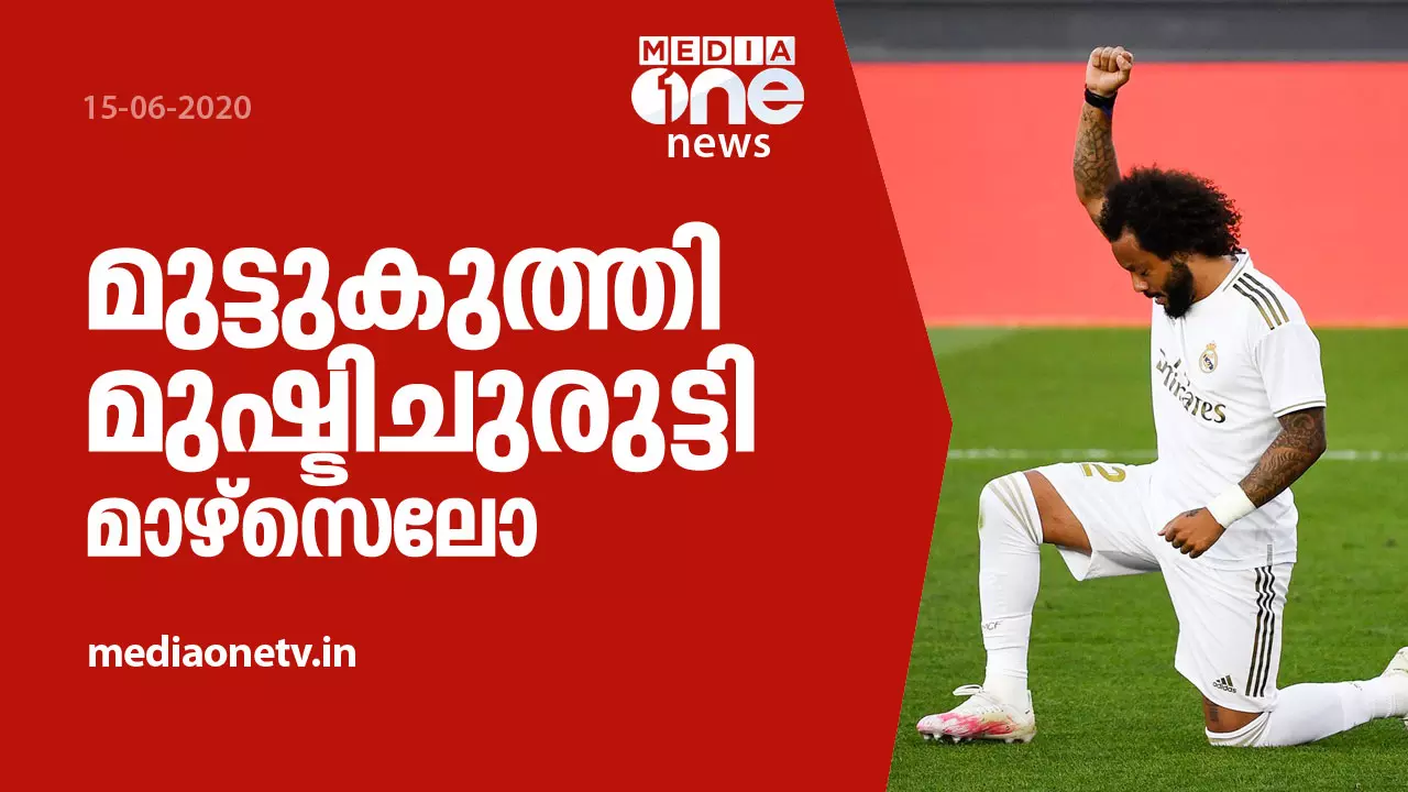 'ബ്ലാക്ക് ലൈവ്സ് മാറ്റര്' മുന്നേറ്റത്തിന് പിന്തുണയുമായി റയല്മാഡ്രിഡ് താരം മാഴ്സെലോ. ലാലിഗയില് എയ്ബറിനെതിരായ മത്സരത്തില് മൂന്നാം ഗോള് നേടിയ ശേഷമാണ് ബ്രസീലിയന് താരം മുട്ടുകുത്തിയിരുന്ന് വംശീയ വിദ്വേഷത്തിനെതിരായ പോരാട്ടങ്ങള്ക്ക് പിന്തുണ പ്രഖ്യാപിച്ചത്. കോവിഡ് ഇടവേളക്കു ശേഷം കളിക്കാനിറങ്ങിയ റയല്മാഡ്രിഡ് 3-1ന് എയ്ബറിനെ തോല്പിച്ചു.